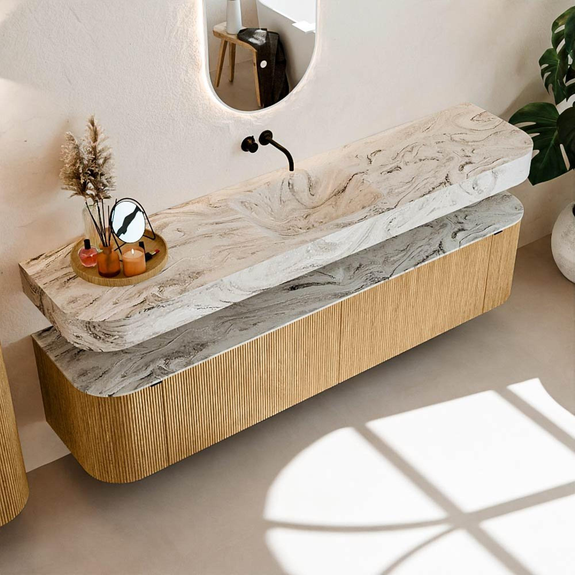 Au-dessus du meuble flotte une vasque suspendue assortie aux coins arrondis – parfaitement adaptée à la forme du meuble. La vasque est réalisée en Solid Surface et suit subtilement les lignes du meuble inférieur, créant ainsi un ensemble harmonieux. Le plan de travail en Solid Surface forme une base solide et facile d'entretien et complète la combinaison.