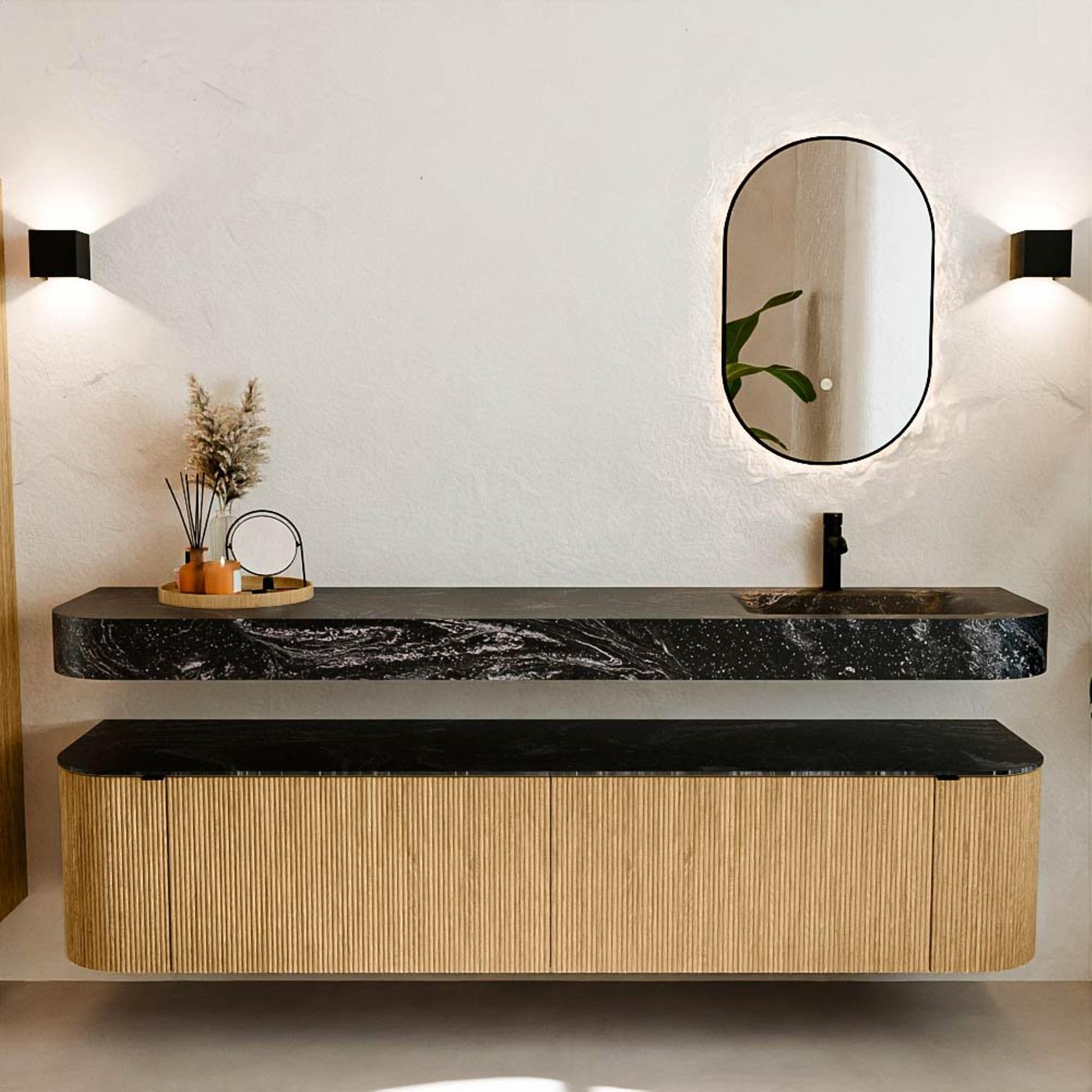 Matériaux naturels dans des tons chauds. Les nervures verticales apportent rythme et texture au design, tandis que le chêne confère une apparence chaleureuse et artisanale. Choisissez parmi 5 teintes de bois CHÊNE, NOYER, DUSK, SHADOW et RUBY, des couleurs de bois soigneusement sélectionnées pour enrichir les salles de bains modernes et classiques.