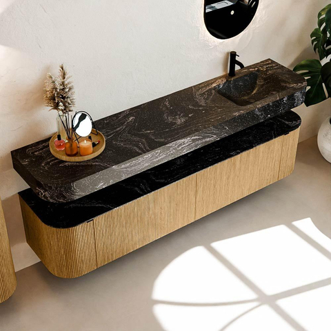 MONDIAZ THOR-DLUX 200cm meuble de salle de bains arrondi gauche + droite couleur Chêne avec 2 tiroirs et 2 portes. Vasque suspendue CLOUD Droite 1 trou de robinet couleur Lava.