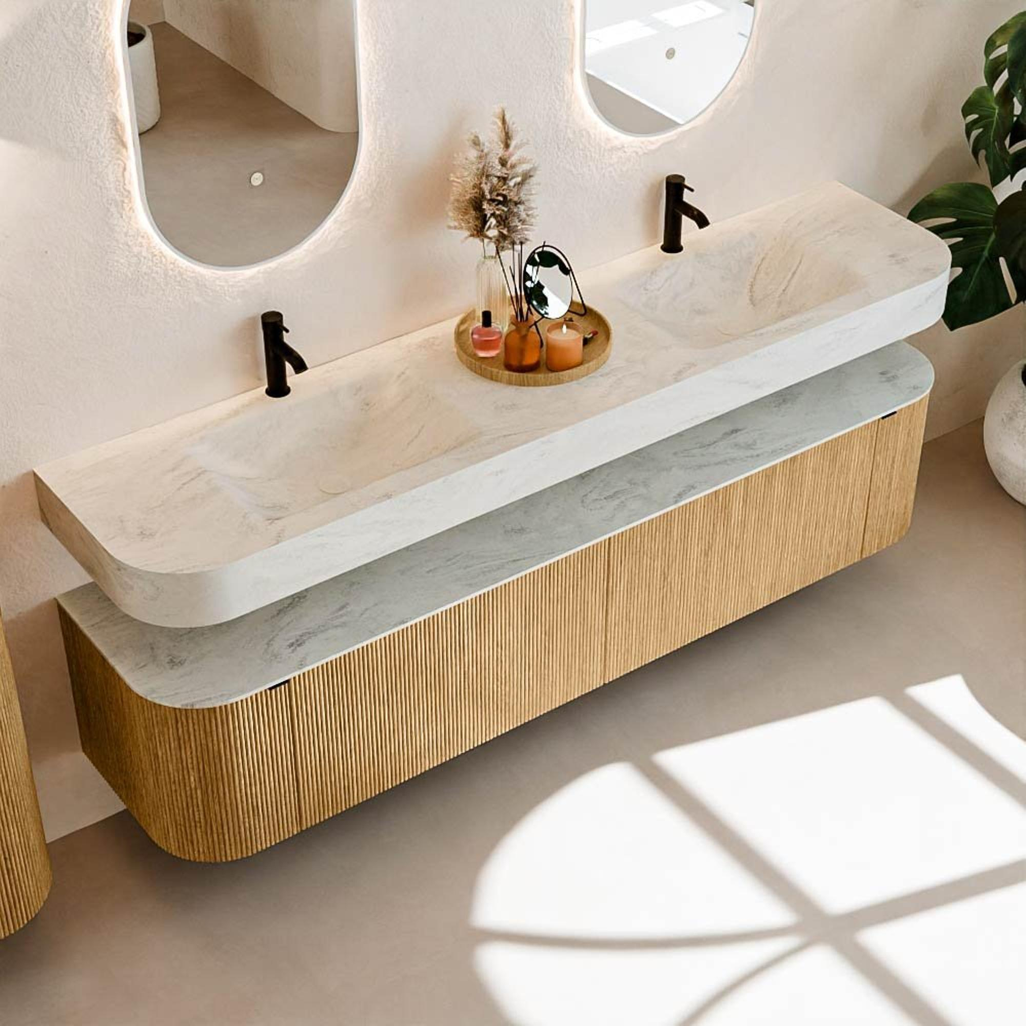 Au-dessus du meuble flotte une vasque suspendue assortie aux coins arrondis – parfaitement adaptée à la forme du meuble. La vasque est en Solid Surface et suit subtilement les lignes du meuble inférieur, créant ainsi un ensemble harmonieux. Le plan de travail en Solid Surface forme une base solide, facile d'entretien, complétant la combinaison.