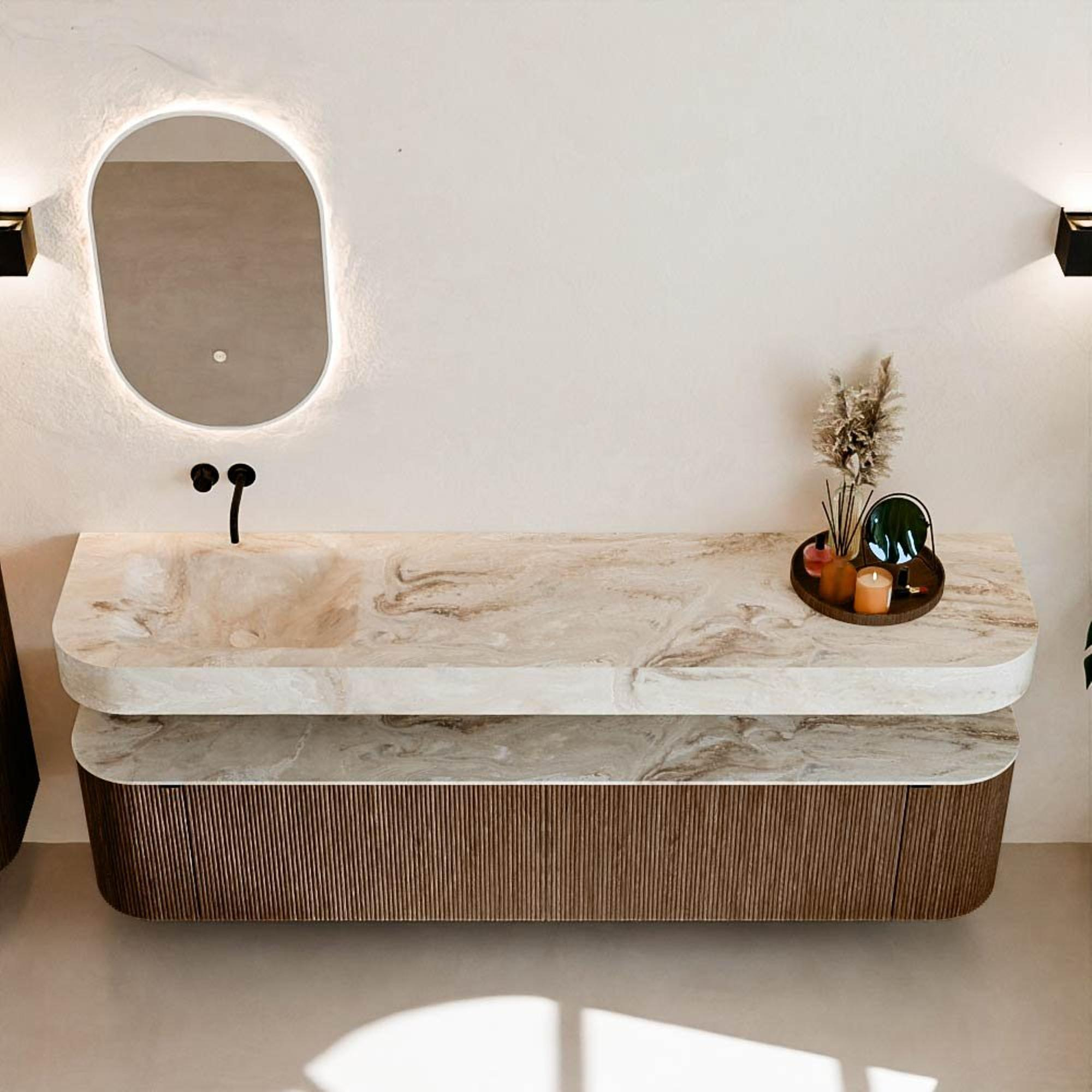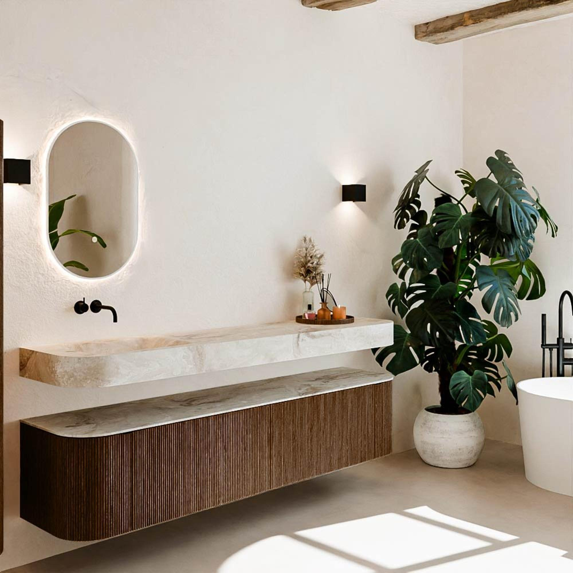 Matériaux naturels dans des tons chauds. Les nervures verticales apportent rythme et texture au design, tandis que le chêne confère une apparence chaleureuse et artisanale. Choisissez parmi 5 teintes de bois OAK, WALNUT, DUSK, SHADOW et RUBY, des couleurs de bois soigneusement sélectionnées pour enrichir les salles de bains modernes et classiques.