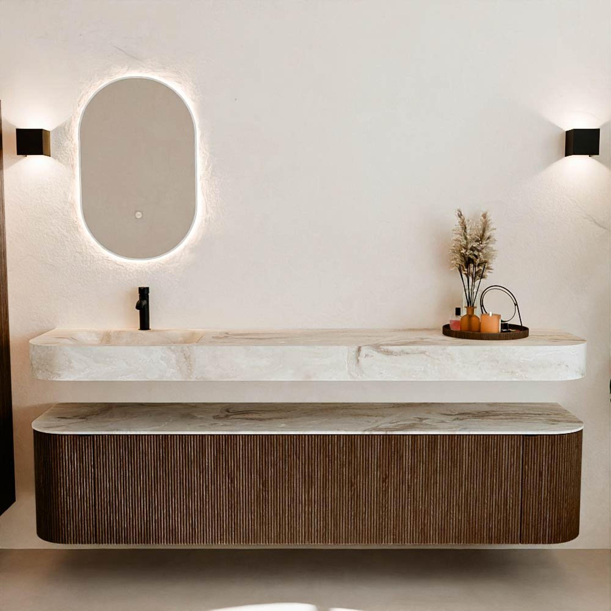 Matériaux naturels dans des tons chauds. Les nervures verticales apportent rythme et texture au design, tandis que le chêne confère une apparence chaleureuse et artisanale. Choisissez parmi 5 teintes de bois OAK, WALNUT, DUSK, SHADOW et RUBY, des couleurs de bois soigneusement sélectionnées pour enrichir les salles de bains modernes et classiques.