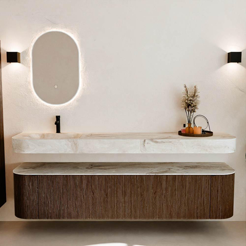 MONDIAZ THOR-DLUX 200cm meuble de salle de bains arrondi gauche + droite couleur Walnut avec 2 tiroirs et 2 portes. Vasque suspendue CLOUD Gauche 1 trou de robinet couleur Frappe.
