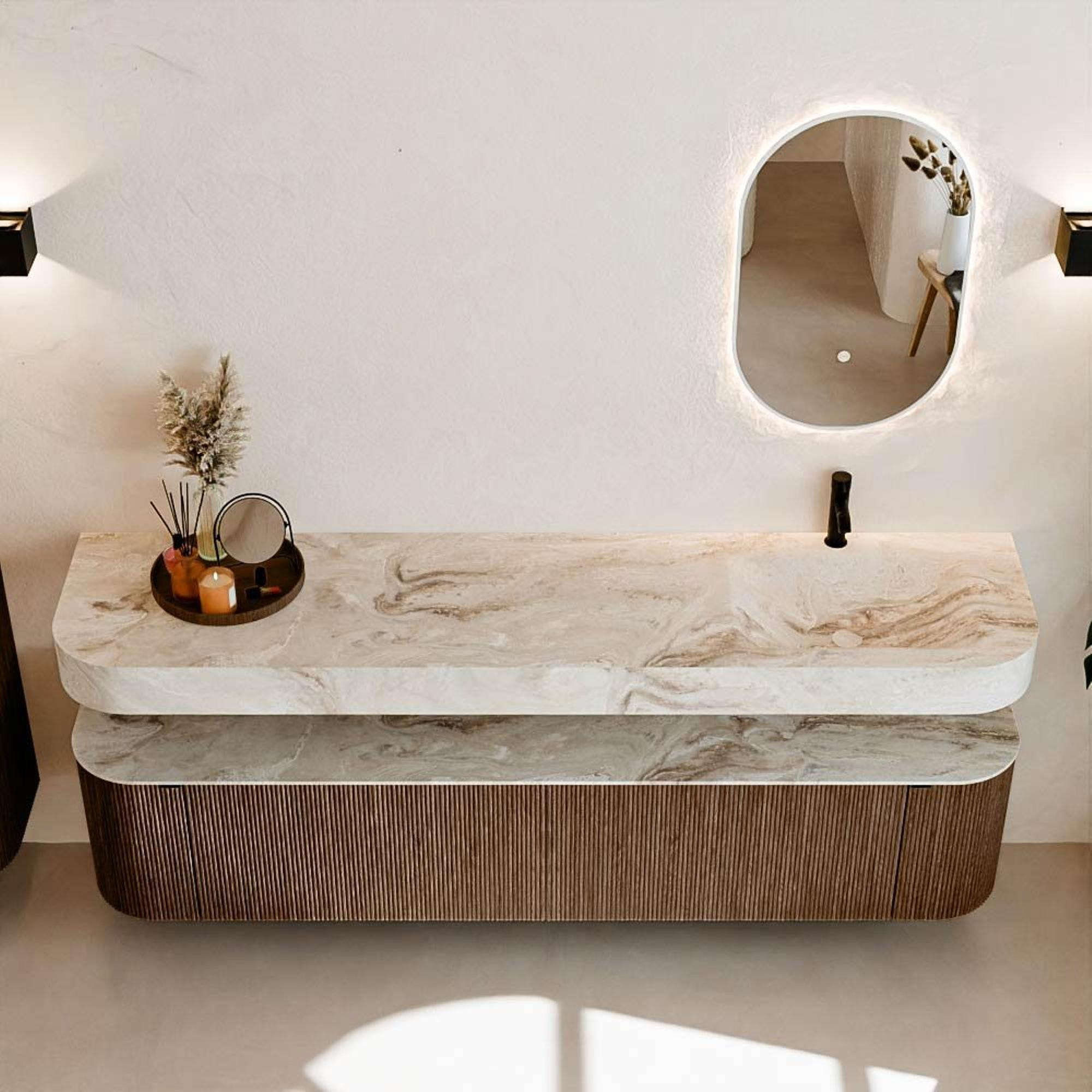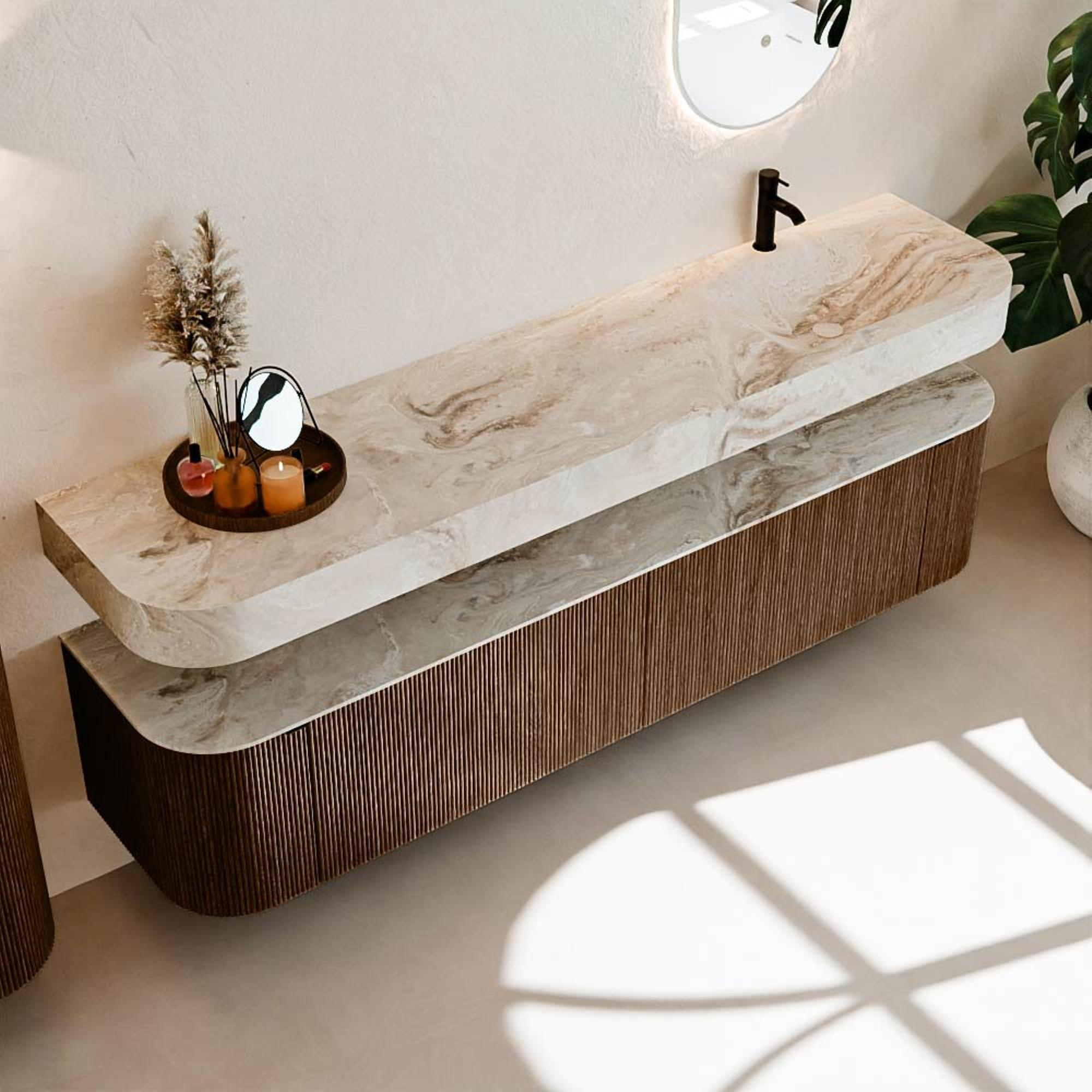 Au-dessus du meuble flotte une vasque suspendue assortie aux coins arrondis – parfaitement adaptée à la forme du meuble. La vasque est réalisée en Solid Surface et suit subtilement les lignes du meuble inférieur, créant ainsi un ensemble harmonieux. Le plan de travail en Solid Surface forme une base solide, facile d'entretien et complète la combinaison.