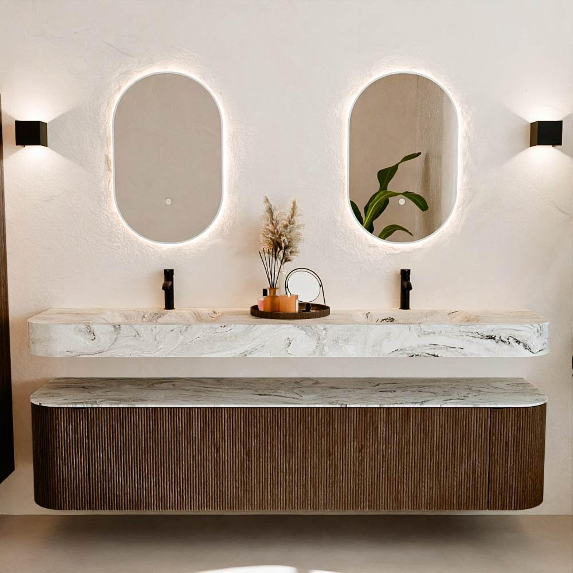 MONDIAZ THOR-DLUX 200cm meuble de salle de bains arrondi gauche + droite couleur Walnut avec 2 tiroirs et 2 portes. Vasque suspendue CLOUD Double 2 trous de robinet couleur Glace.