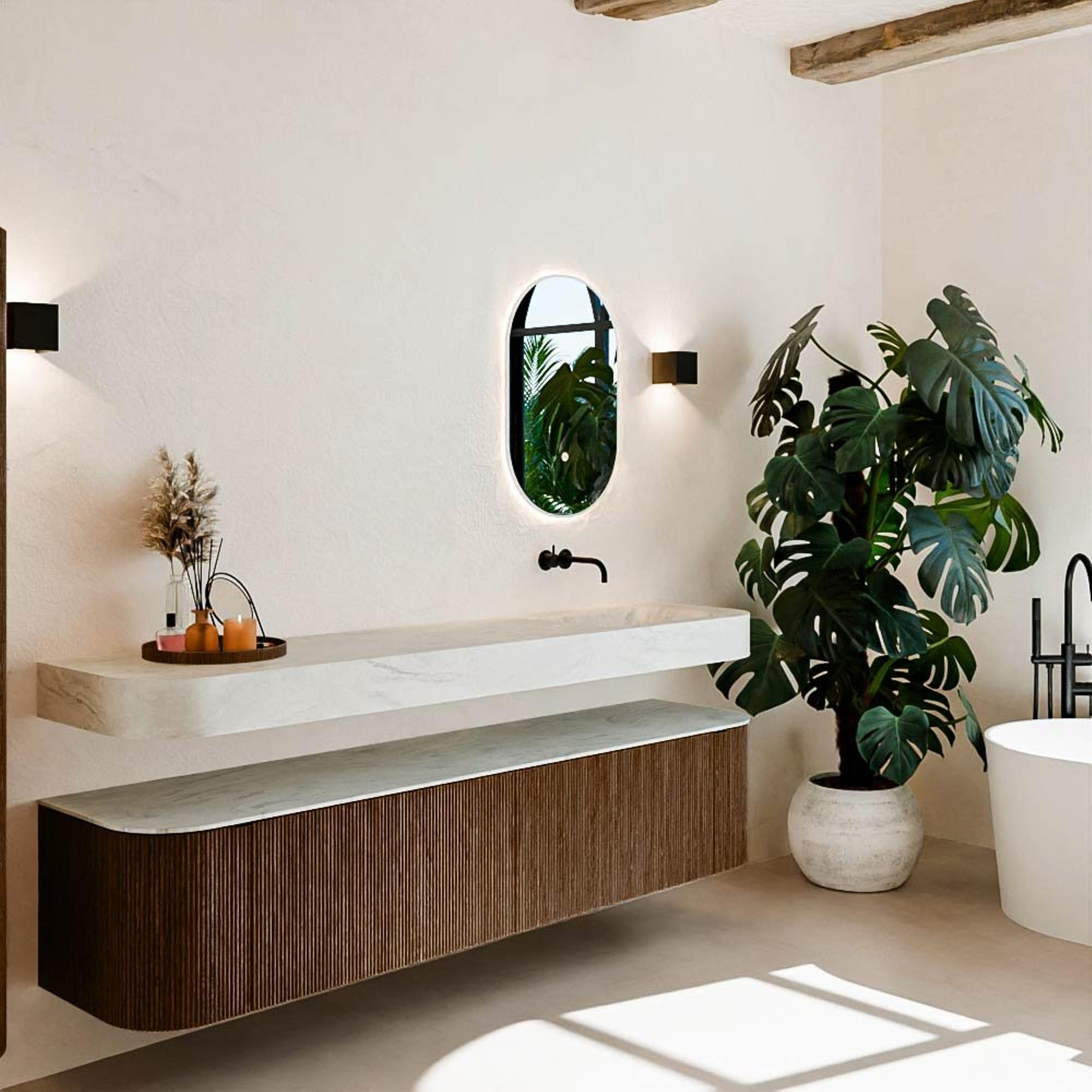 Matériaux naturels dans des tons chauds. Les nervures verticales apportent rythme et texture au design, tandis que le chêne confère une apparence chaleureuse et artisanale. Choisissez parmi 5 teintes de bois OAK, WALNUT, DUSK, SHADOW et RUBY, des couleurs de bois soigneusement sélectionnées pour enrichir les salles de bains modernes et classiques.