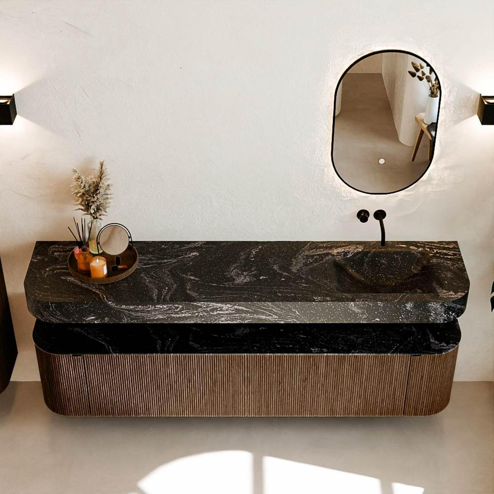 MONDIAZ THOR-DLUX 200cm meuble de salle de bains arrondi gauche + droite couleur Walnut avec 2 tiroirs et 2 portes. Vasque suspendue CLOUD Droite sans trou de robinet couleur Lava.