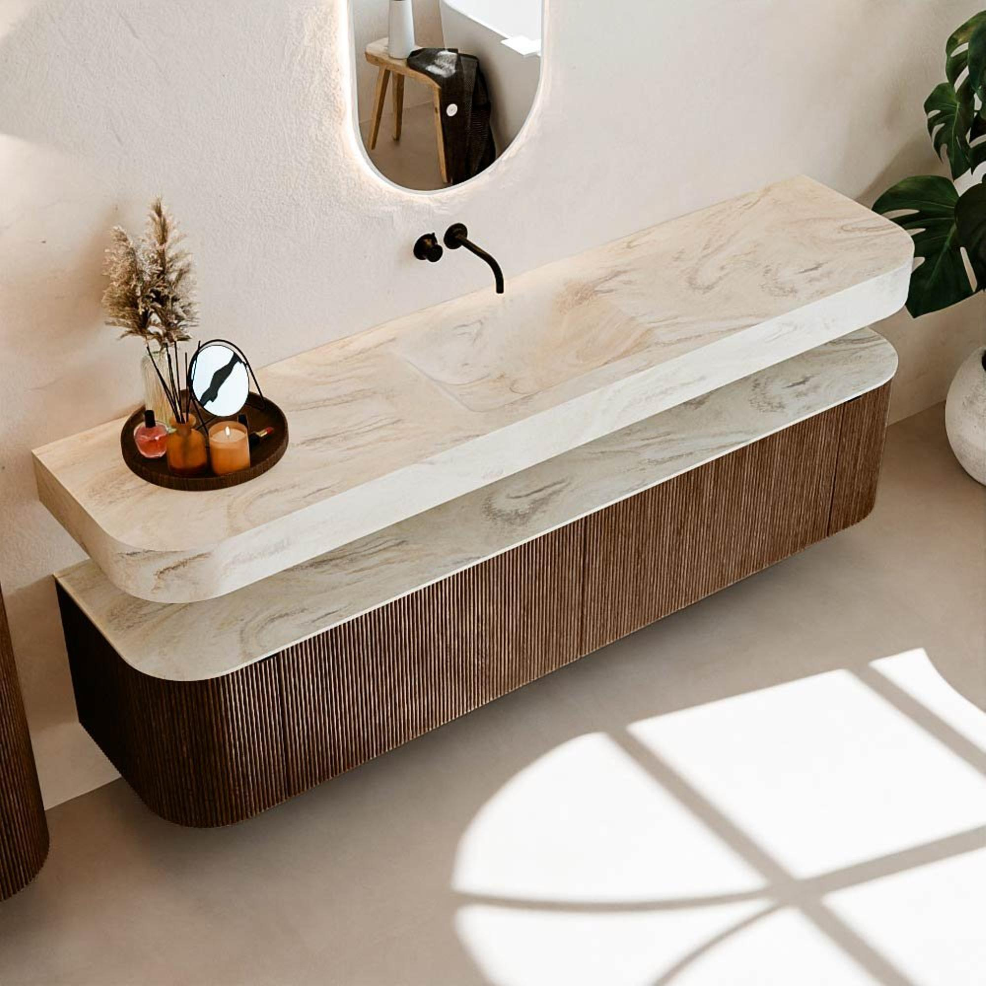 Au-dessus du meuble flotte une vasque suspendue assortie aux coins arrondis – parfaitement adaptée à la forme du meuble. La vasque est réalisée en Solid Surface et suit subtilement les lignes du meuble inférieur, créant ainsi un ensemble harmonieux. Le plan de travail en Solid Surface forme une base solide, facile d'entretien et complète la combinaison.