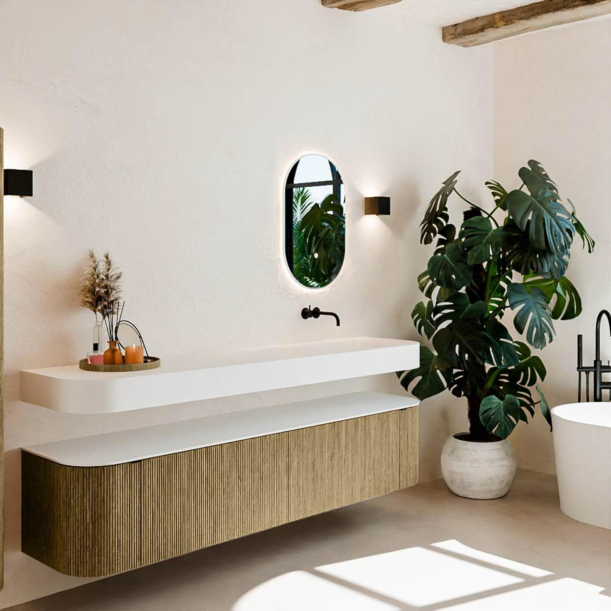 Matériaux naturels dans des tons chauds. Les nervures verticales apportent rythme et texture au design, tandis que le chêne confère une apparence chaleureuse et artisanale. Choisissez parmi 5 teintes de bois OAK, WALNUT, DUSK, SHADOW et RUBY, des couleurs de bois soigneusement sélectionnées pour enrichir les salles de bains modernes et classiques.