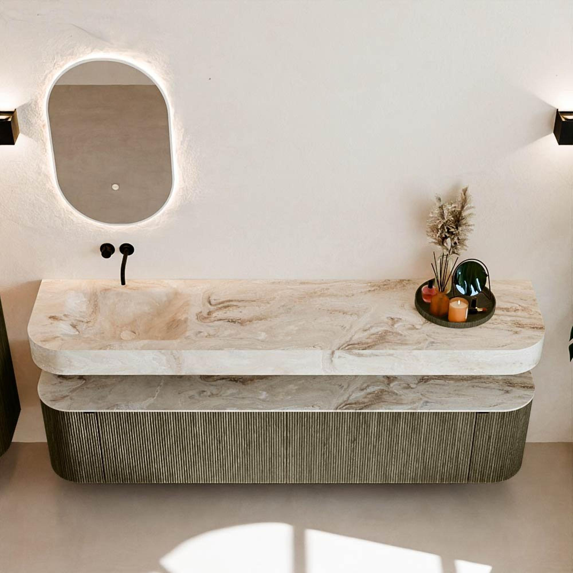 Au-dessus du meuble flotte une vasque suspendue assortie aux coins arrondis – parfaitement adaptée à la forme du meuble. La vasque est réalisée en Solid Surface et suit subtilement les lignes du meuble inférieur, créant ainsi un ensemble harmonieux. Le plan de travail en Solid Surface forme une base solide et facile d'entretien et complète la combinaison.