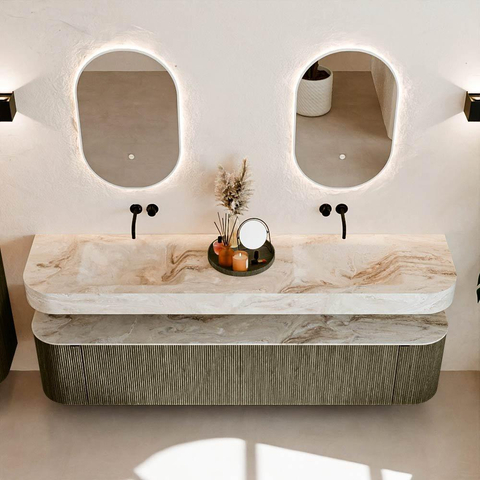 Matériaux naturels dans des tons chauds. Les nervures verticales apportent rythme et texture au design, tandis que le chêne confère une apparence chaleureuse et artisanale. Choisissez parmi 5 teintes de bois OAK, WALNUT, DUSK, SHADOW et RUBY, des couleurs de bois soigneusement sélectionnées pour enrichir les salles de bains modernes et classiques.