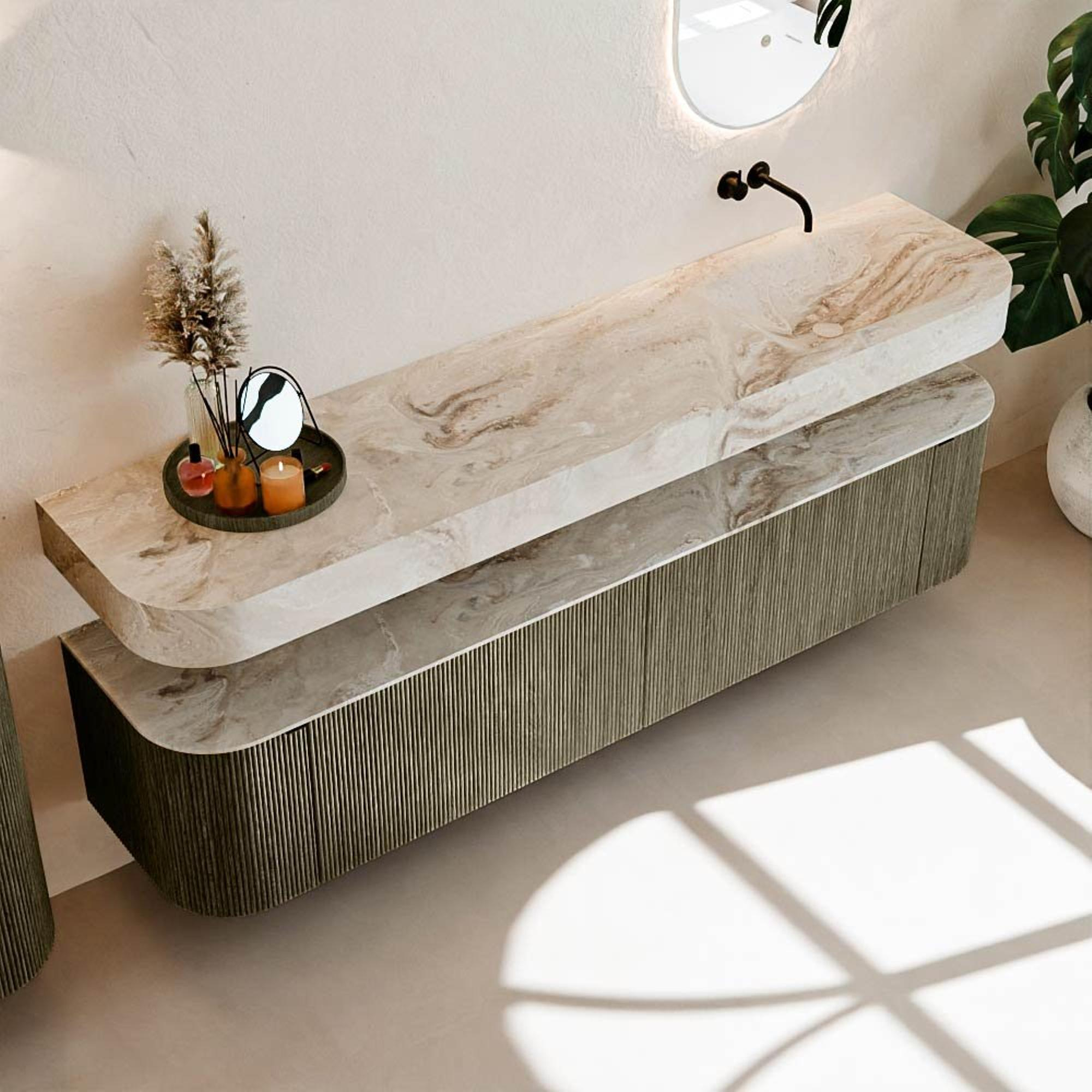 Au-dessus du meuble flotte une vasque suspendue assortie aux coins arrondis – parfaitement adaptée à la forme du meuble. La vasque est réalisée en Solid Surface et suit subtilement les lignes du meuble inférieur, créant ainsi un ensemble harmonieux. Le plan de travail en Solid Surface forme une base solide et facile d'entretien et complète la combinaison.