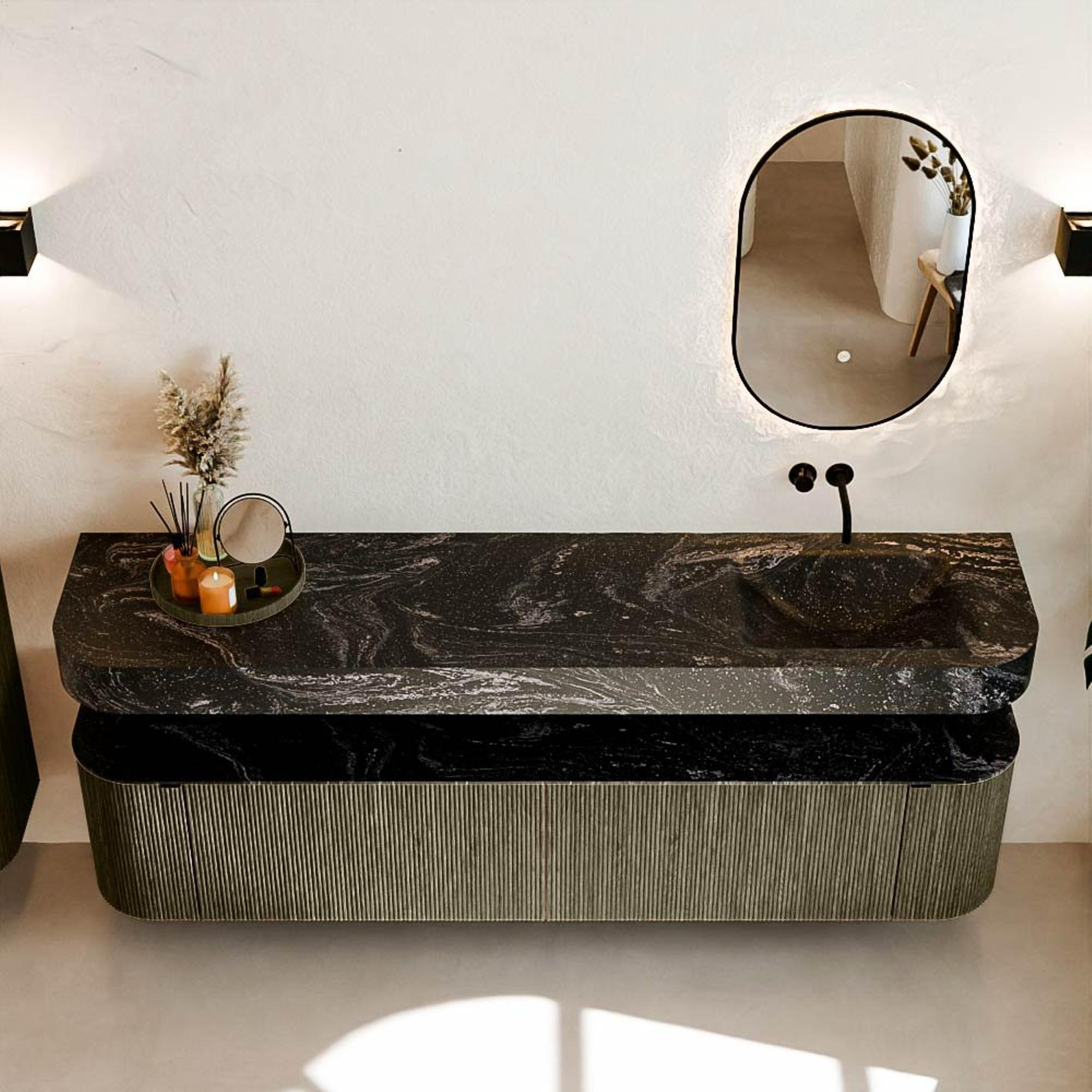 MONDIAZ THOR-DLUX 200cm meuble de salle de bains arrondi gauche + droite couleur Shadow avec 2 tiroirs et 2 portes. Vasque suspendue CLOUD droite sans trou de robinet couleur Lava.