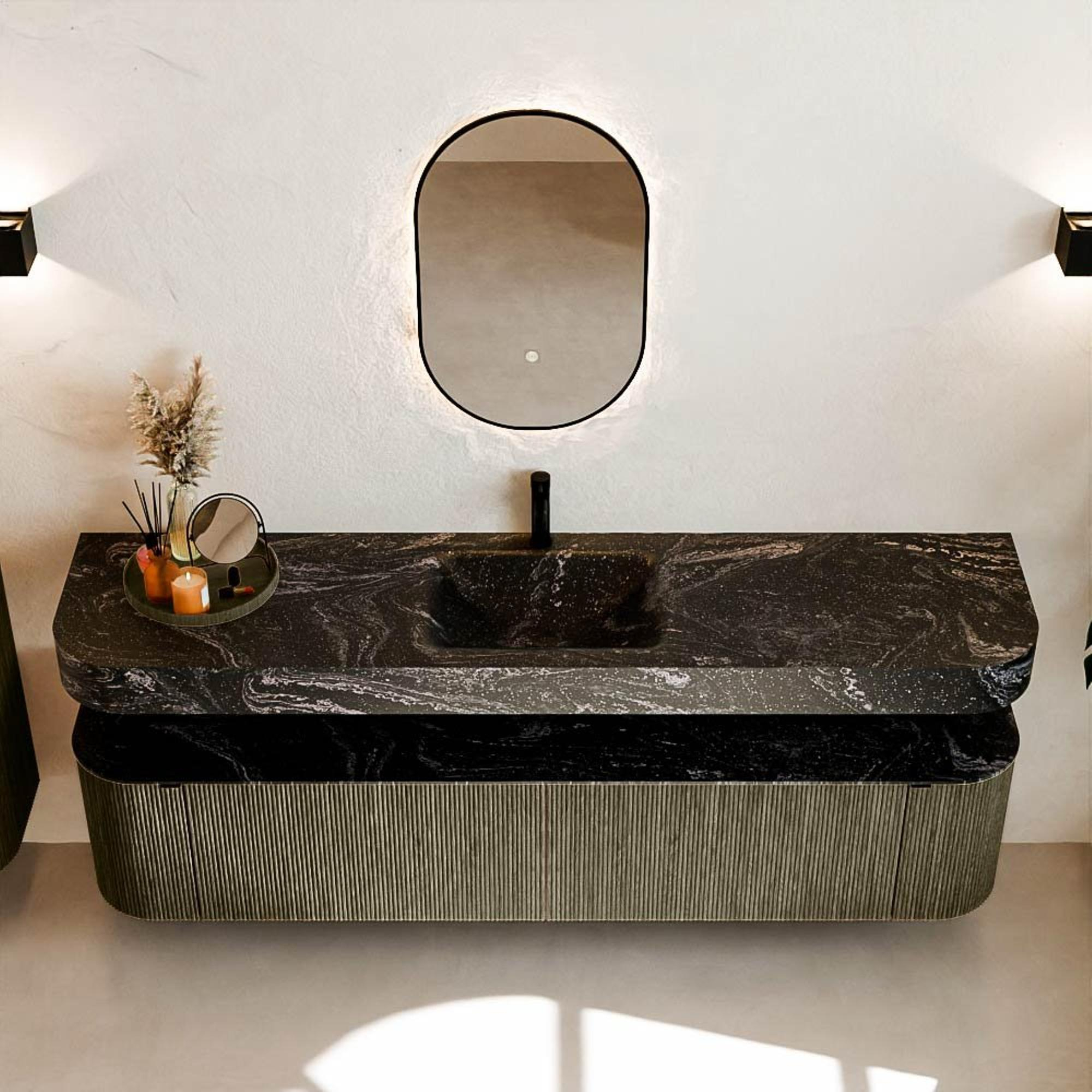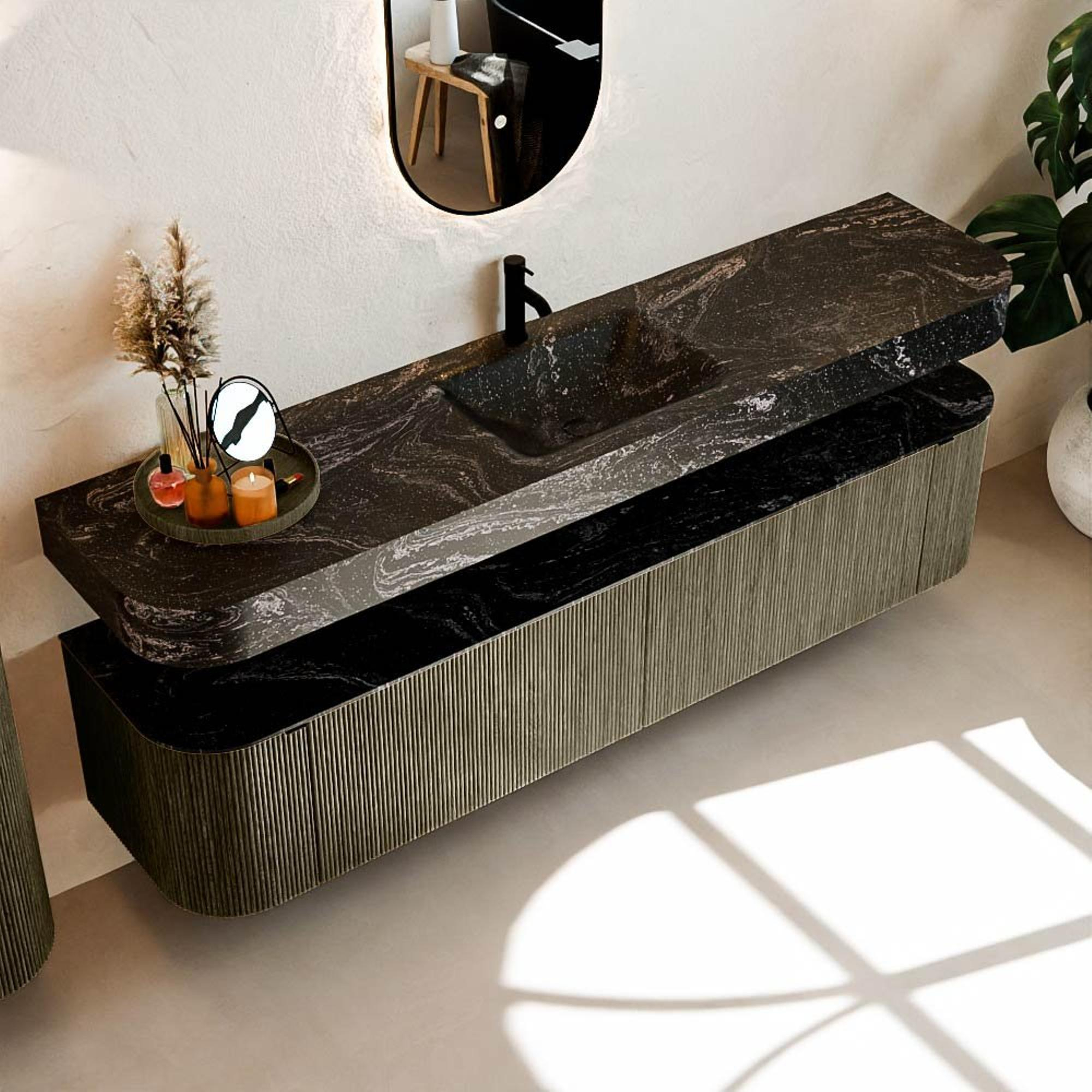 MONDIAZ THOR-DLUX 200cm meuble de salle de bains arrondi gauche + droite couleur Shadow avec 2 tiroirs et 2 portes. Vasque suspendue CLOUD Milieu 1 trou de robinet couleur Lava.