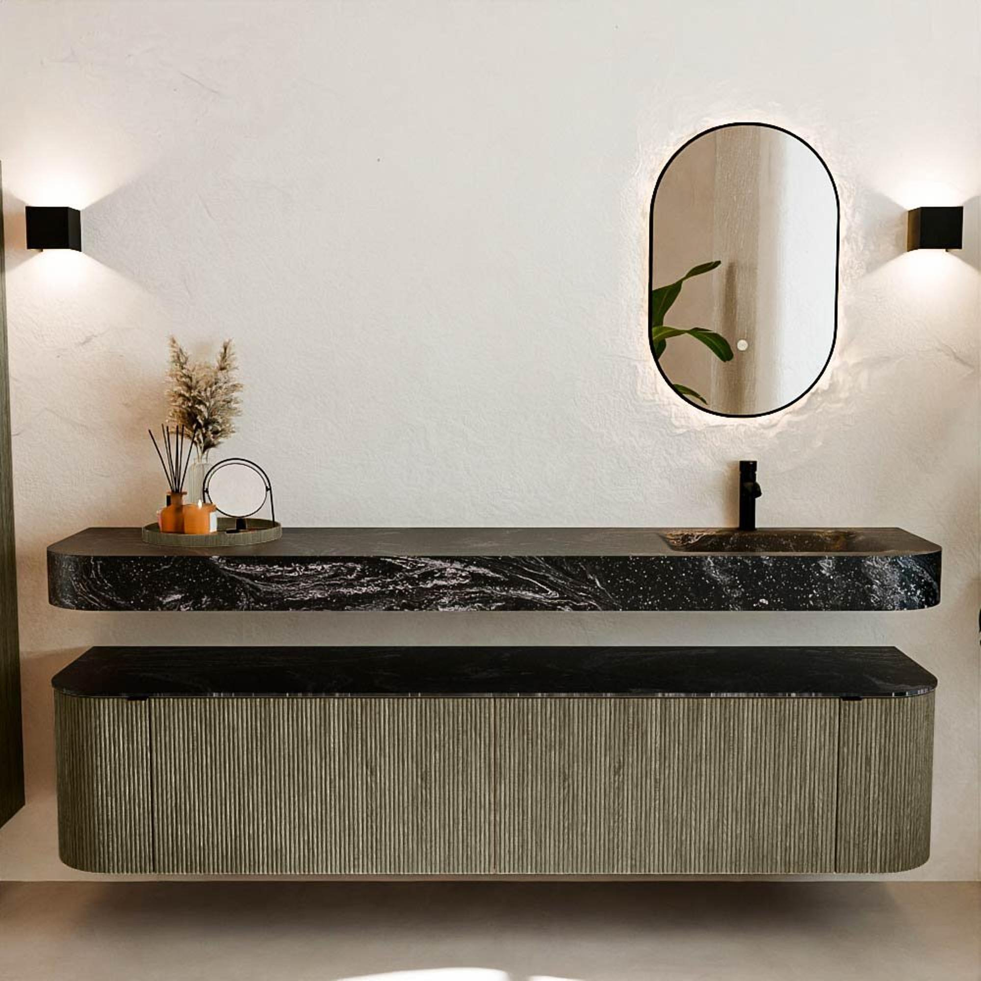 MONDIAZ THOR-DLUX Meuble de salle de bains 200cm arrondi gauche + droite couleur Shadow avec 2 tiroirs et 2 portes. Vasque suspendue CLOUD Droite 1 trou de robinet couleur Lava.
