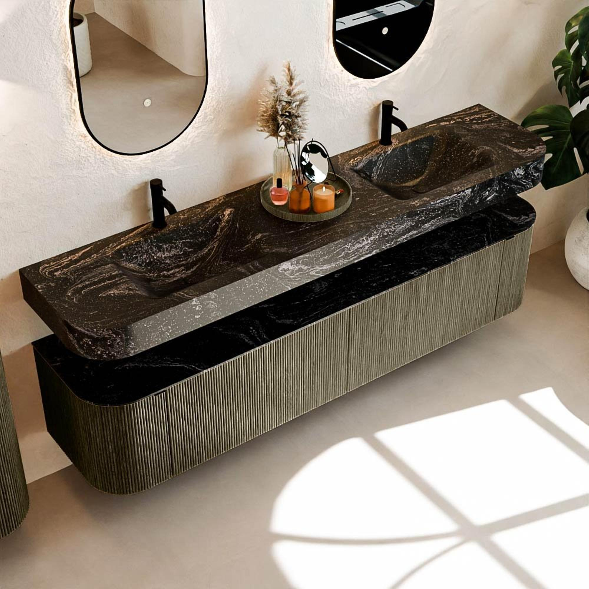 Matériaux naturels dans des tons chauds. Les cannelures verticales apportent rythme et texture au design, tandis que le chêne confère une apparence chaleureuse et artisanale. Choisissez parmi 5 teintes de bois OAK, WALNUT, DUSK, SHADOW et RUBY, des couleurs de bois soigneusement sélectionnées pour enrichir les salles de bains modernes et classiques.