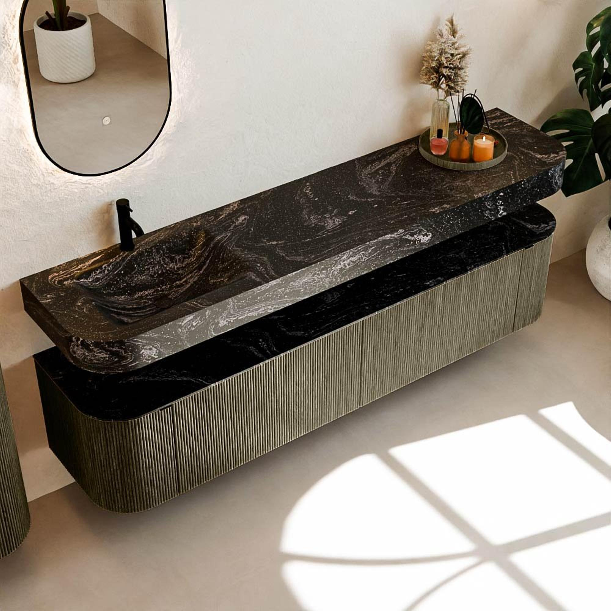 Matériaux naturels dans des tons chauds. Les cannelures verticales apportent rythme et texture au design, tandis que le chêne confère une apparence chaleureuse et artisanale. Choisissez parmi 5 teintes de bois OAK, WALNUT, DUSK, SHADOW et RUBY, des couleurs de bois soigneusement sélectionnées pour enrichir les salles de bains modernes et classiques.