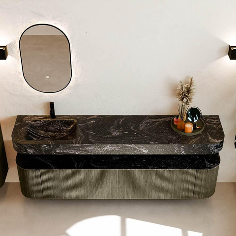 MONDIAZ THOR-DLUX 200cm meuble de salle de bains arrondi gauche + droite couleur Shadow avec 2 tiroirs et 2 portes. Vasque suspendue CLOUD Gauche 1 trou de robinet couleur Lava.