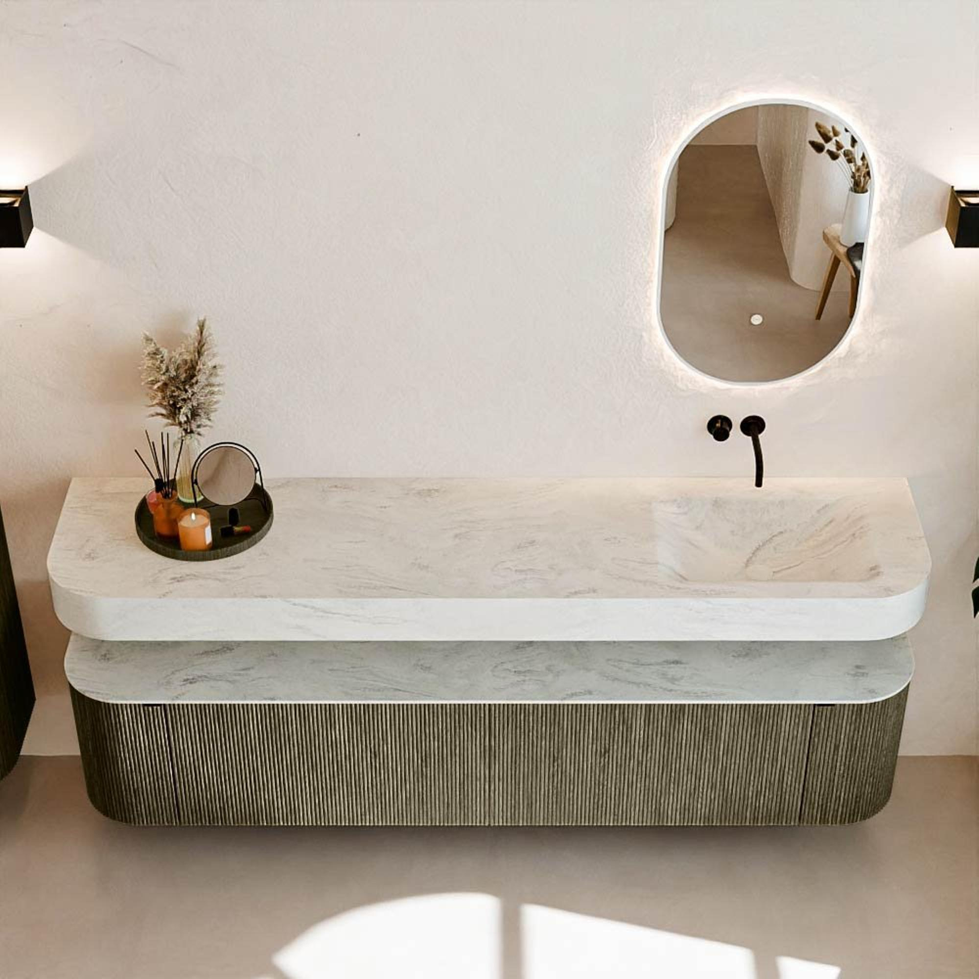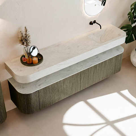 Au-dessus du meuble flotte une vasque suspendue assortie avec des coins arrondis – parfaitement adaptée à la forme du meuble. La vasque est réalisée en Solid Surface et suit subtilement les lignes du meuble inférieur, créant ainsi un ensemble harmonieux. Le plan de travail en Solid Surface forme une base solide et facile d'entretien et complète la combinaison.