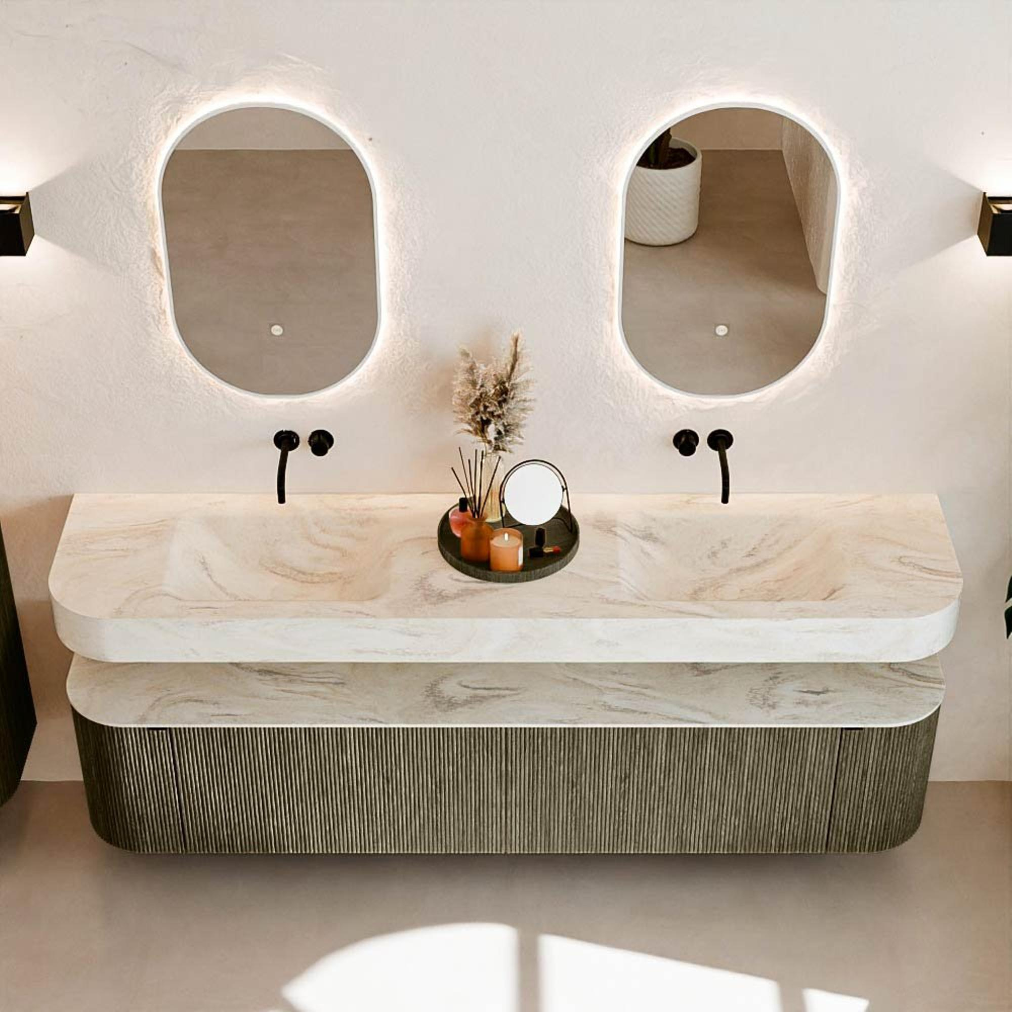 Matériaux naturels dans des tons chauds. Les cannelures verticales apportent rythme et texture au design, tandis que le chêne confère une apparence chaleureuse et artisanale. Choisissez parmi 5 teintes de bois OAK, WALNUT, DUSK, SHADOW et RUBY, des couleurs de bois soigneusement sélectionnées pour enrichir les salles de bains modernes et classiques.
