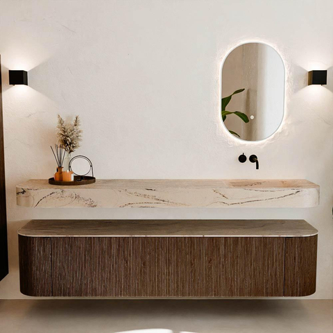 Matériaux naturels dans des tons chauds. Les cannelures verticales apportent rythme et texture au design, tandis que le chêne confère une apparence chaleureuse et artisanale. Choisissez parmi 5 teintes de bois OAK, WALNUT, DUSK, SHADOW et RUBY, des couleurs de bois soigneusement sélectionnées pour enrichir les salles de bains modernes et classiques.