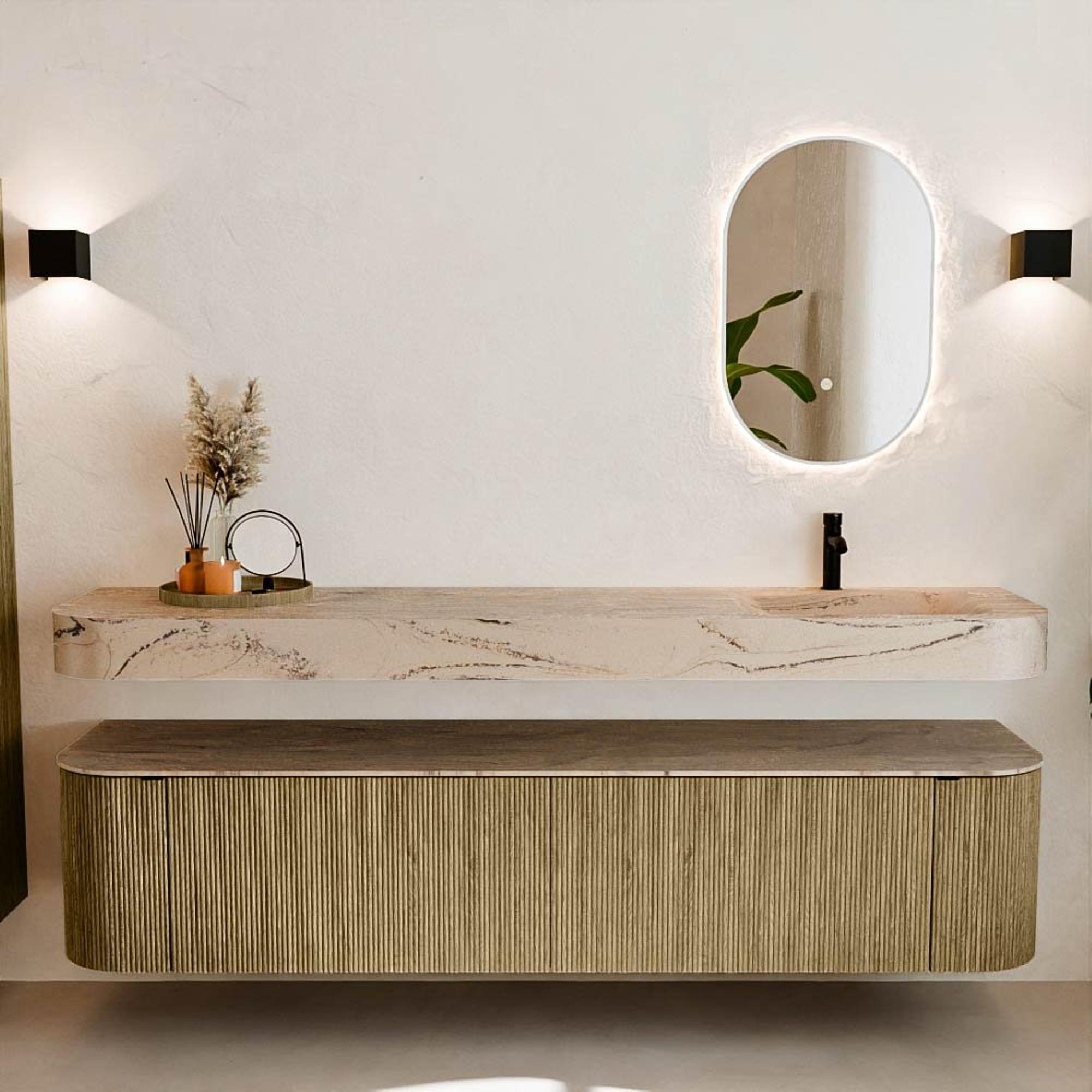 Au-dessus du meuble flotte une vasque suspendue assortie aux angles arrondis – parfaitement adaptée à la forme du meuble. La vasque est en Solid Surface et suit subtilement les lignes du meuble sous-jacent, créant un ensemble harmonieux. Le plan de travail en Solid Surface constitue une base solide et facile d'entretien, complétant la combinaison.