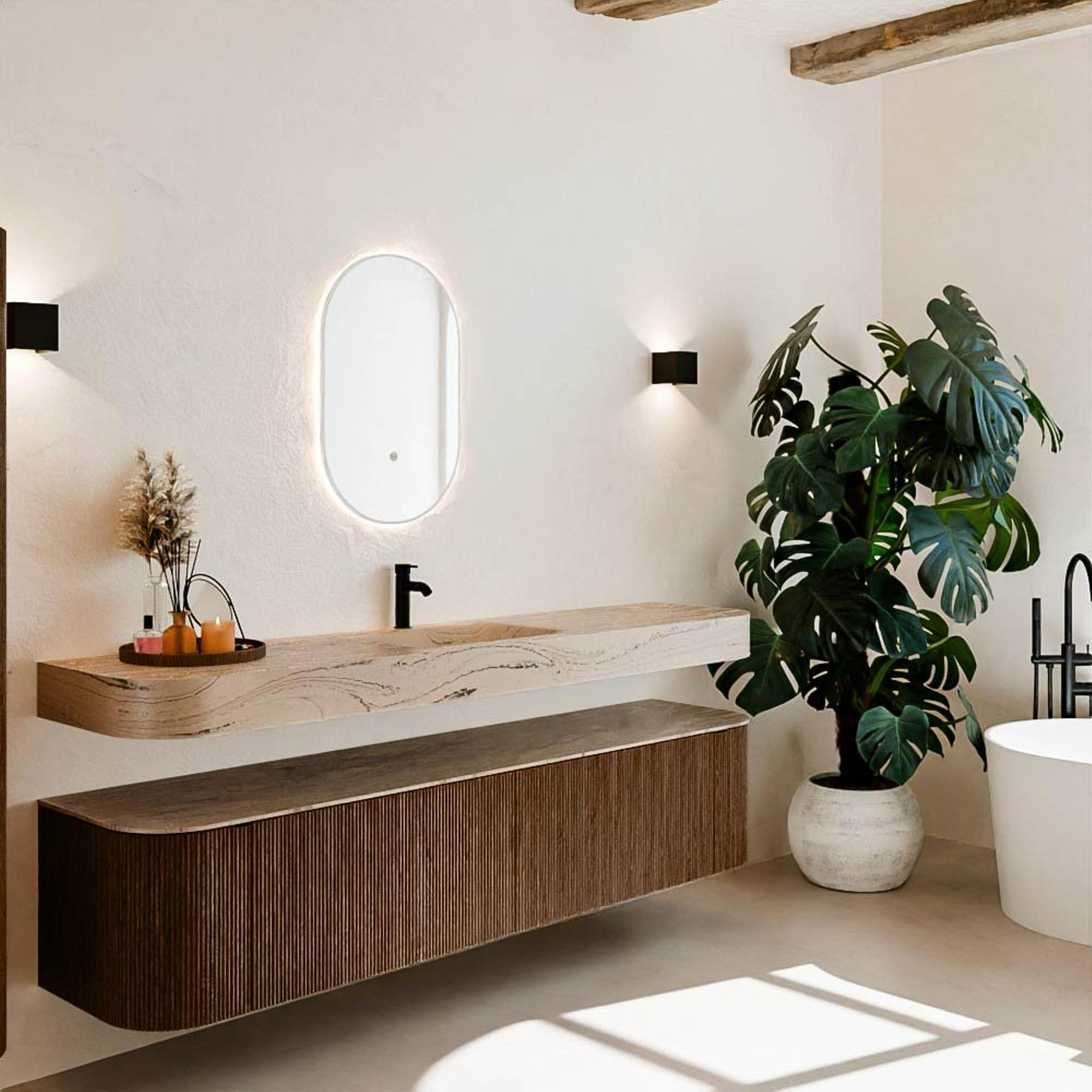 Matériaux naturels aux teintes chaudes. Les nervures verticales apportent rythme et texture au design, tandis que le chêne confère une apparence chaleureuse et artisanale. Choisissez parmi 5 teintes de bois OAK, WALNUT, DUSK, SHADOW et RUBY, des couleurs de bois soigneusement sélectionnées pour enrichir les salles de bains modernes et classiques.