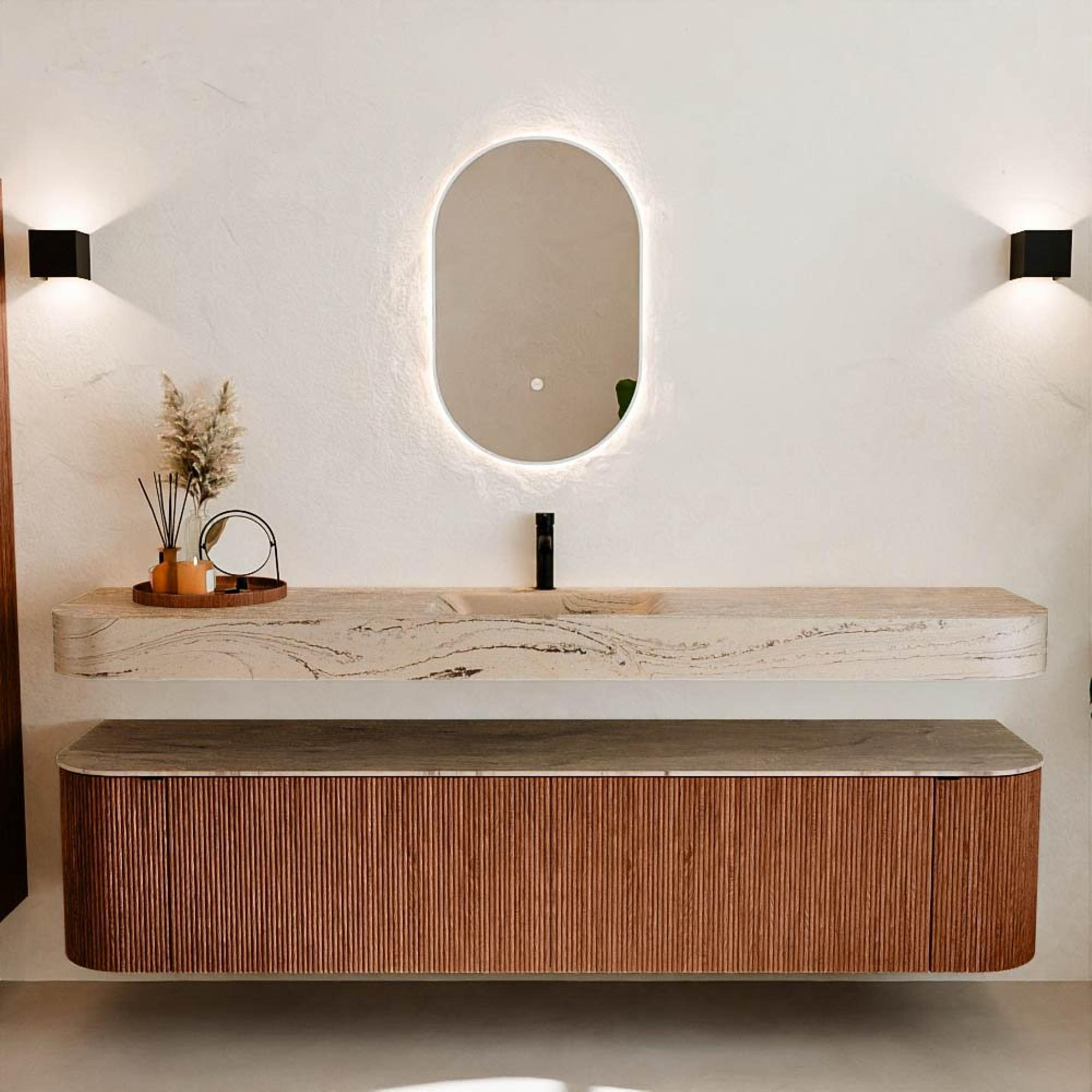 Matériaux naturels dans des tons chauds. Les nervures verticales apportent rythme et texture au design, tandis que le chêne confère une apparence chaleureuse et artisanale. Choisissez parmi 5 teintes de bois OAK, WALNUT, DUSK, SHADOW et RUBY, des couleurs de bois soigneusement sélectionnées pour enrichir les salles de bains modernes et classiques.