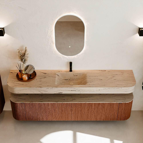 Au-dessus du meuble flotte une vasque suspendue assortie aux coins arrondis – parfaitement adaptée à la forme du meuble. La vasque est en Solid Surface et suit subtilement les lignes du meuble inférieur, créant ainsi un ensemble harmonieux. Le plan de travail en Solid Surface forme une base solide, facile d’entretien et complète la combinaison.