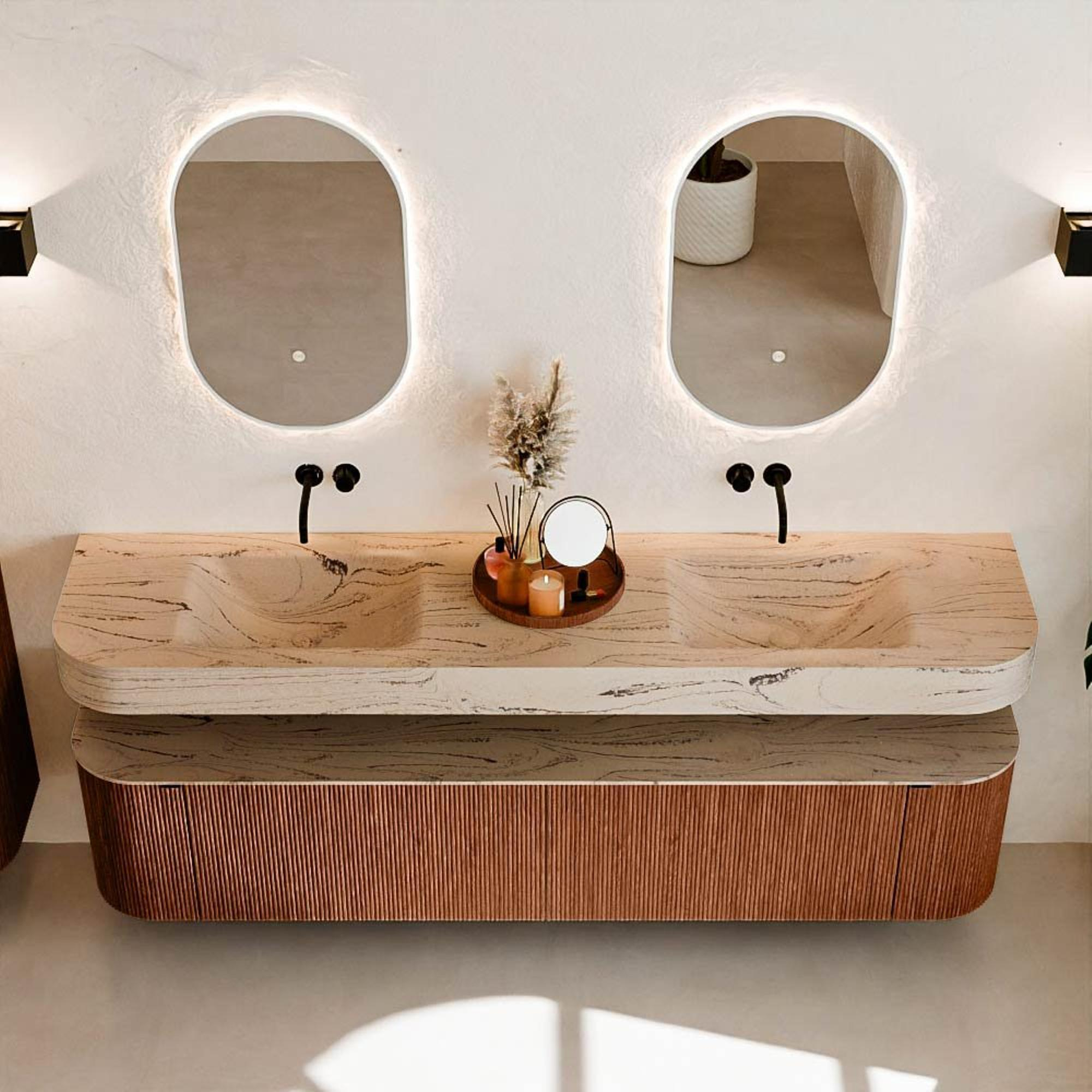 Matériaux naturels dans des tons chauds. Les nervures verticales apportent rythme et texture au design, tandis que le chêne confère une apparence chaleureuse et artisanale. Choisissez parmi 5 teintes de bois OAK, WALNUT, DUSK, SHADOW et RUBY, des couleurs de bois soigneusement sélectionnées pour enrichir les salles de bains modernes et classiques.
