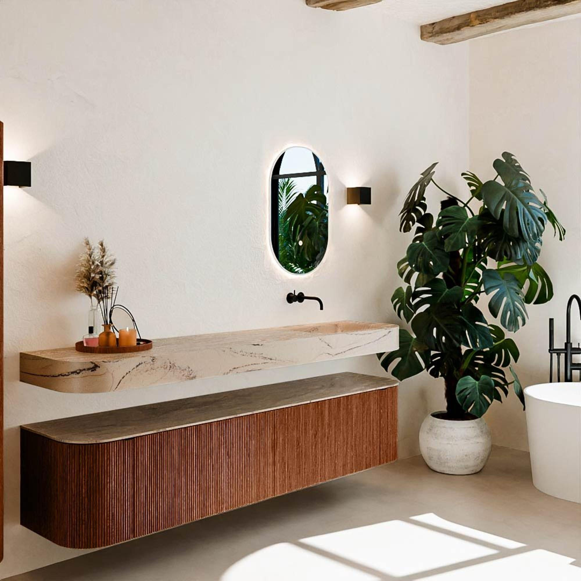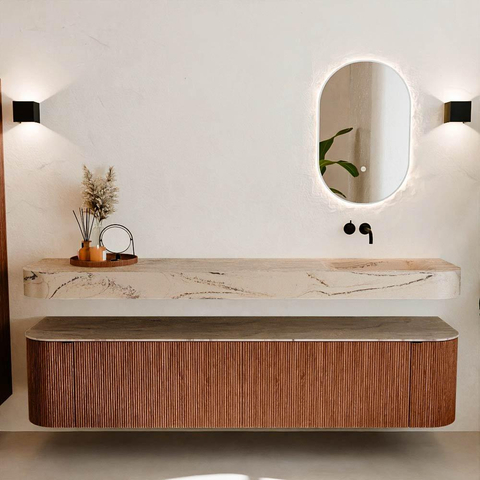 Matériaux naturels dans des tons chauds. Les cannelures verticales apportent rythme et texture au design, tandis que le chêne confère une apparence chaleureuse et artisanale. Choisissez parmi 5 teintes de bois OAK, WALNUT, DUSK, SHADOW et RUBY, des couleurs de bois soigneusement sélectionnées pour enrichir les salles de bains modernes et classiques.