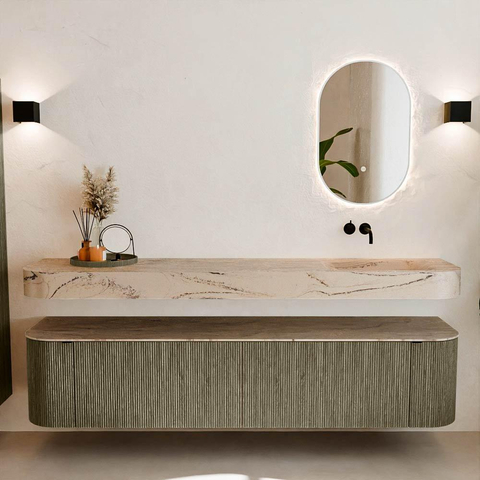 Matériaux naturels dans des tons chauds. Les nervures verticales apportent rythme et texture au design, tandis que le chêne confère une apparence chaleureuse et artisanale. Choisissez parmi 5 teintes de bois OAK, WALNUT, DUSK, SHADOW et RUBY, des couleurs de bois soigneusement sélectionnées pour enrichir les salles de bains modernes et classiques.
