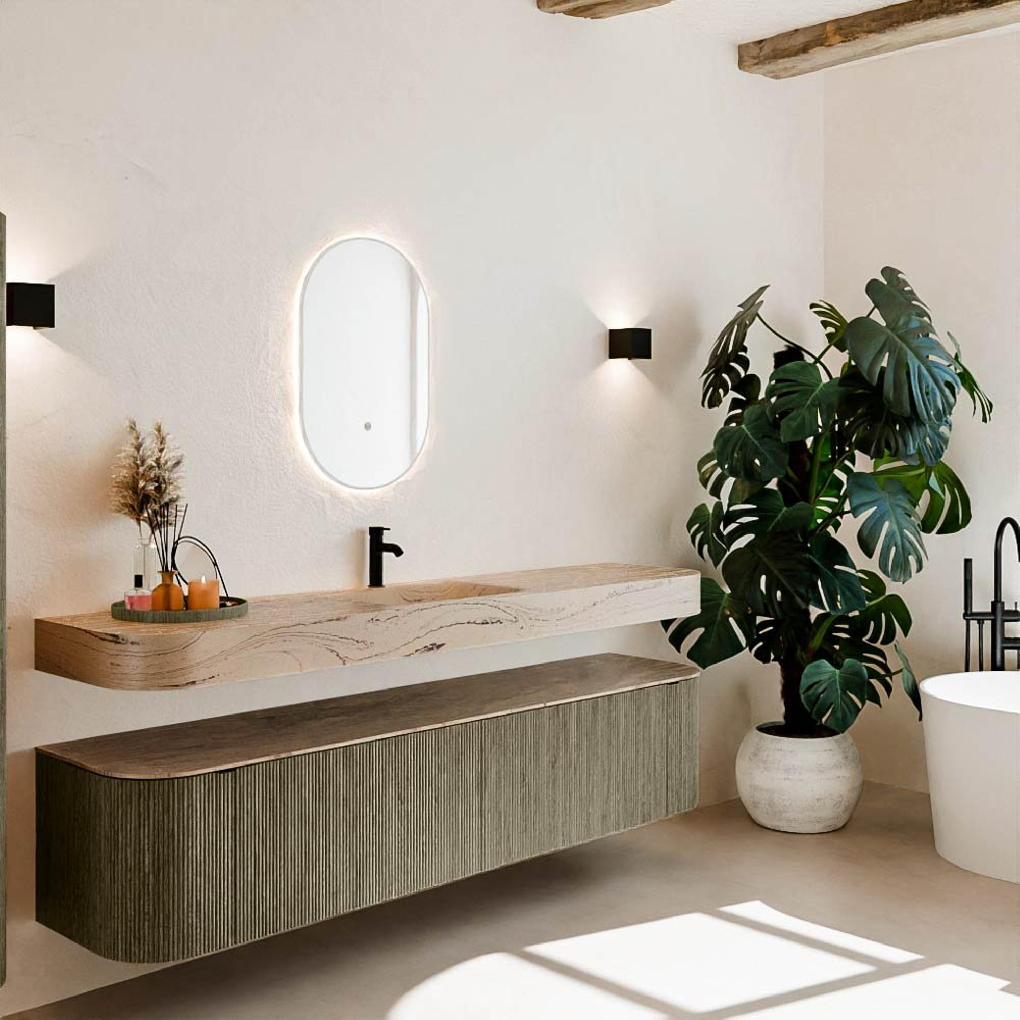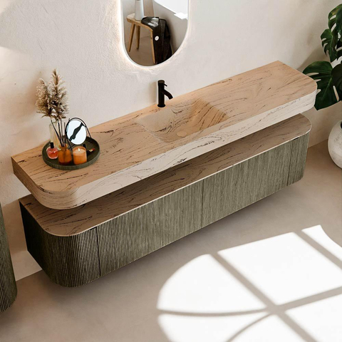 Matériaux naturels dans des tons chauds. Les reliefs verticaux apportent rythme et texture au design, tandis que le chêne confère une apparence chaleureuse et artisanale. Choisissez parmi 5 teintes de bois OAK, WALNUT, DUSK, SHADOW et RUBY, des couleurs de bois soigneusement sélectionnées pour enrichir les salles de bains modernes et classiques.