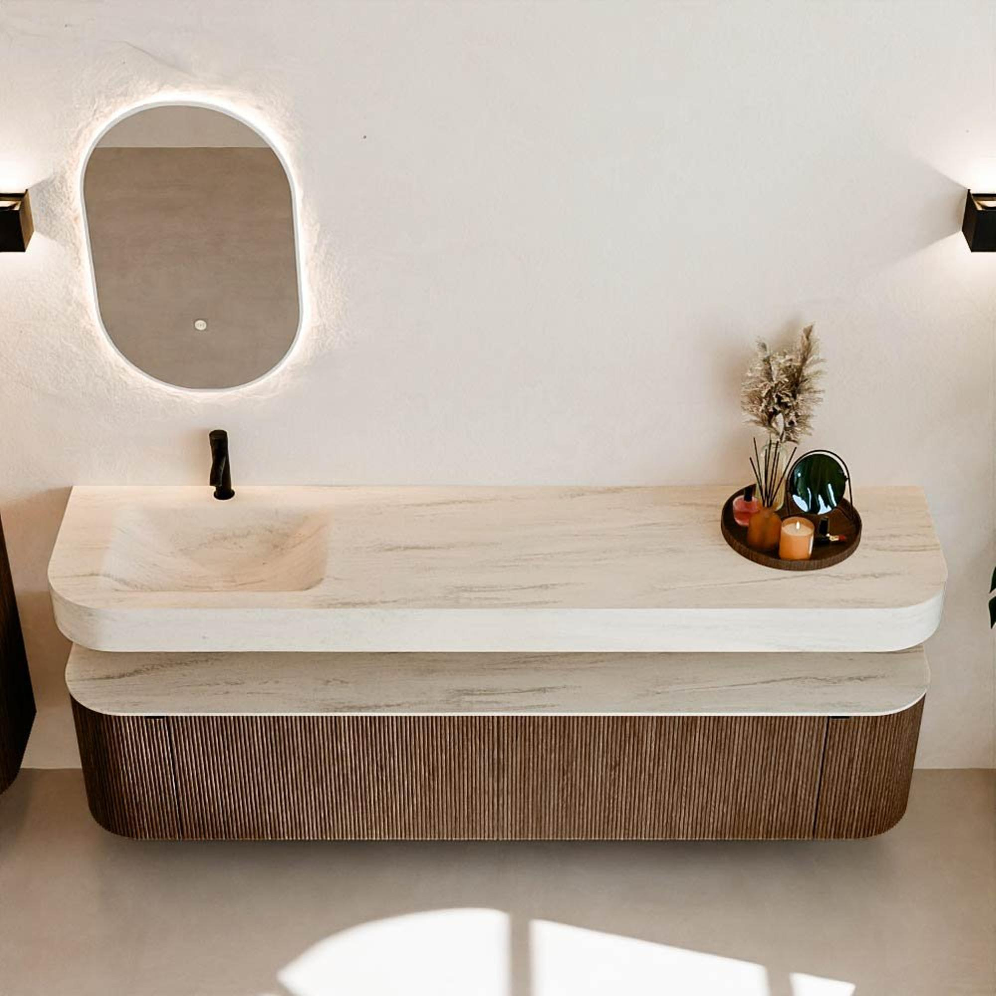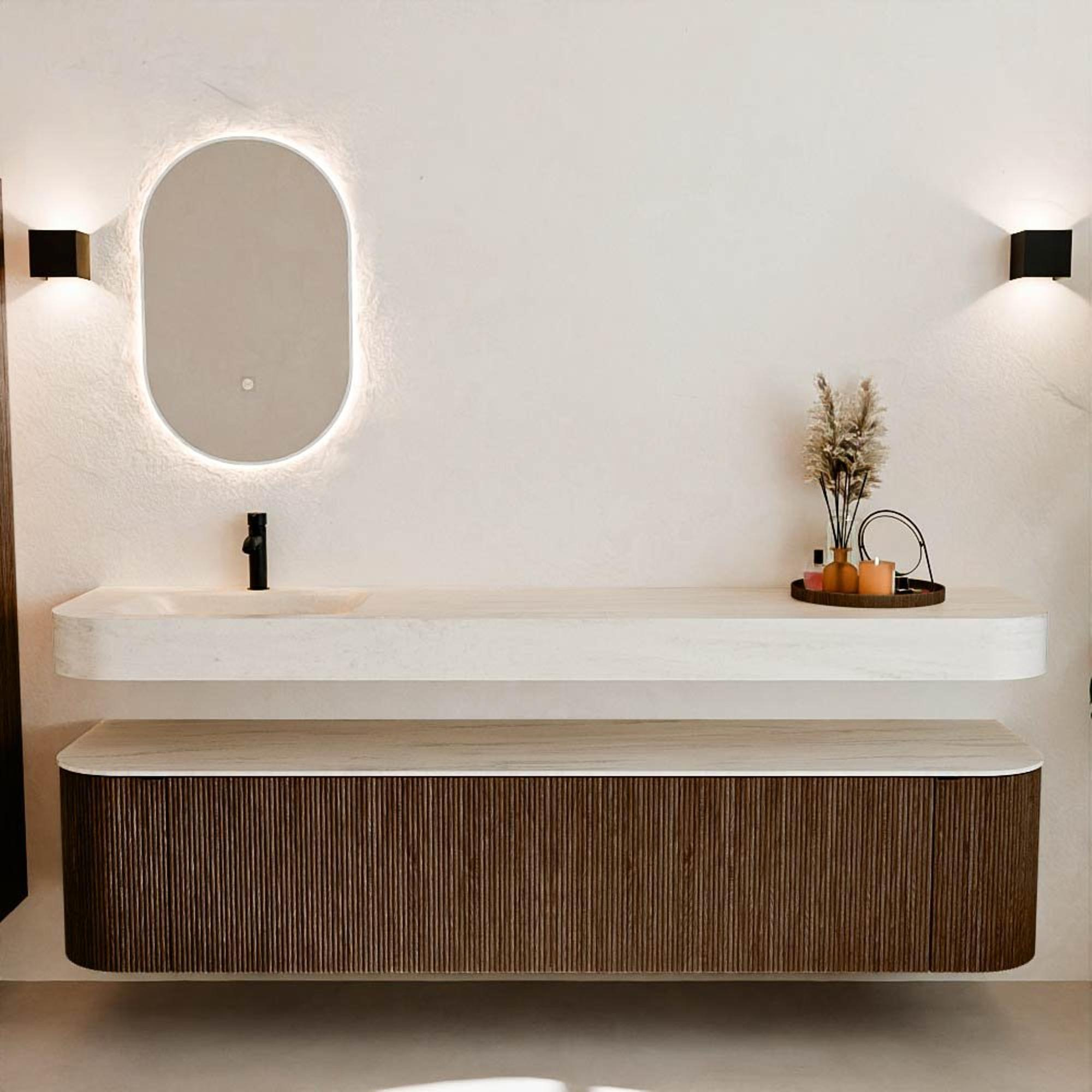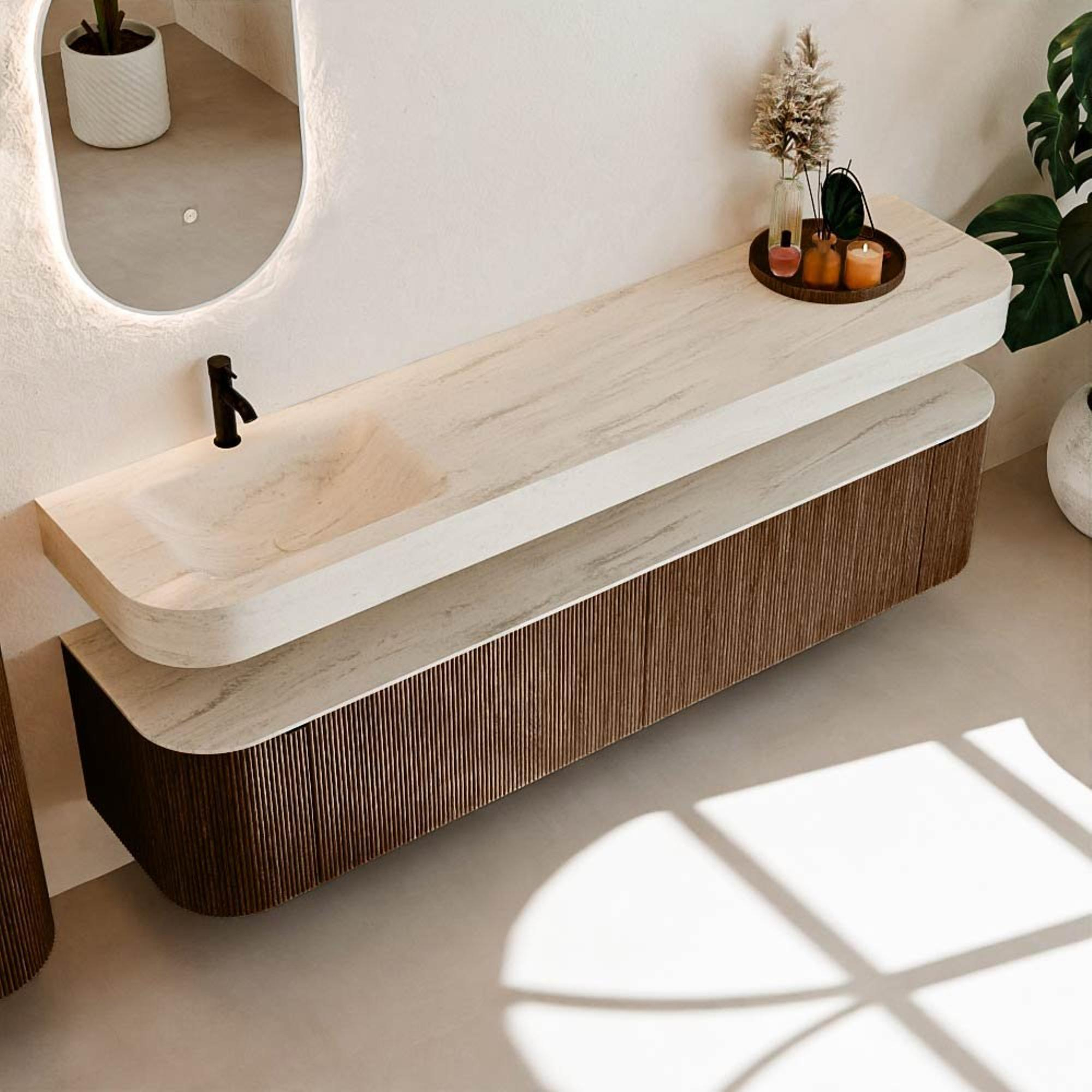 Au-dessus du meuble flotte une vasque suspendue assortie aux coins arrondis – parfaitement adaptée à la forme du meuble. La vasque est réalisée en Solid Surface et suit subtilement les lignes du meuble inférieur, créant ainsi un ensemble harmonieux. Le plan de travail en Solid Surface constitue une base solide, facile d'entretien, complétant la combinaison.