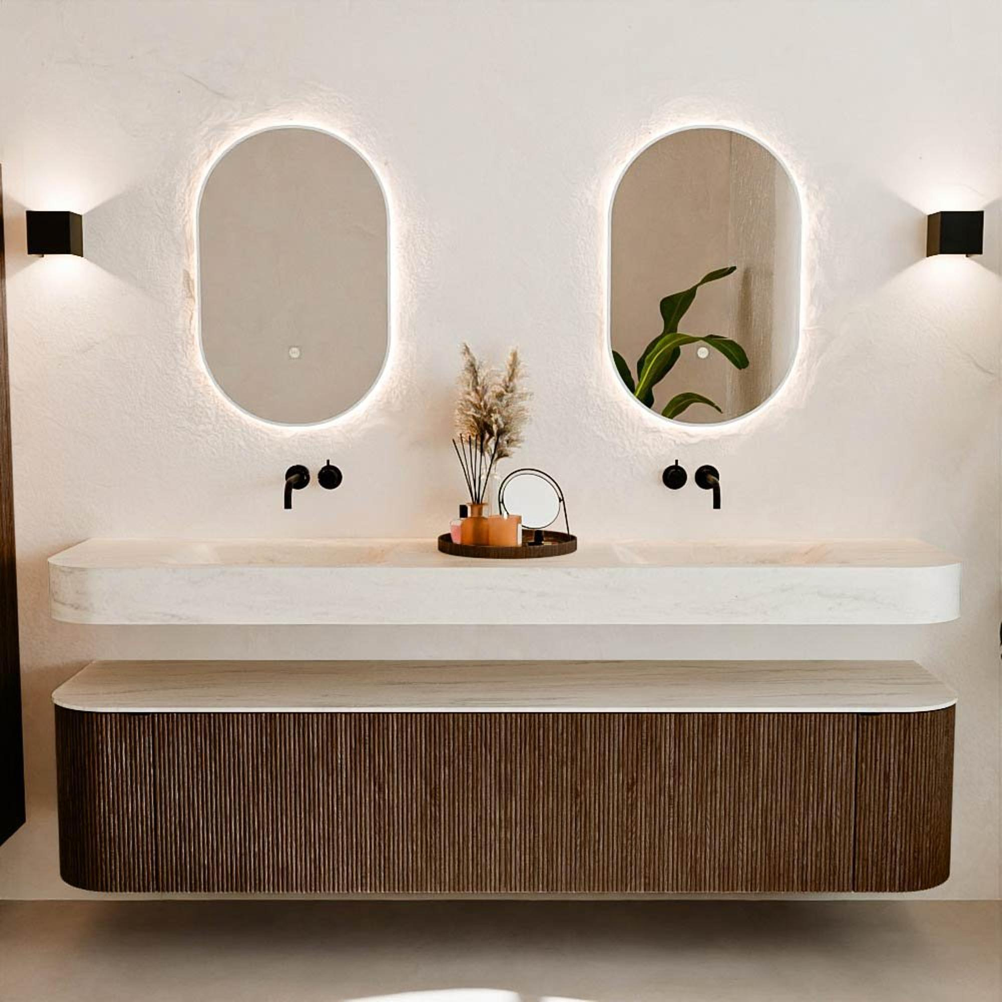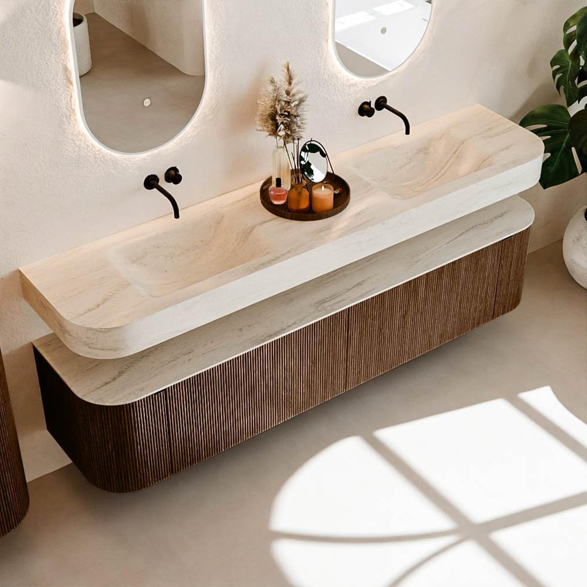 Matériaux naturels dans des tons chauds. Les cannelures verticales apportent rythme et texture au design, tandis que le chêne confère une apparence chaleureuse et artisanale. Choisissez parmi 5 teintes de bois OAK, WALNUT, DUSK, SHADOW et RUBY, des couleurs de bois soigneusement sélectionnées pour enrichir les salles de bains modernes et classiques.