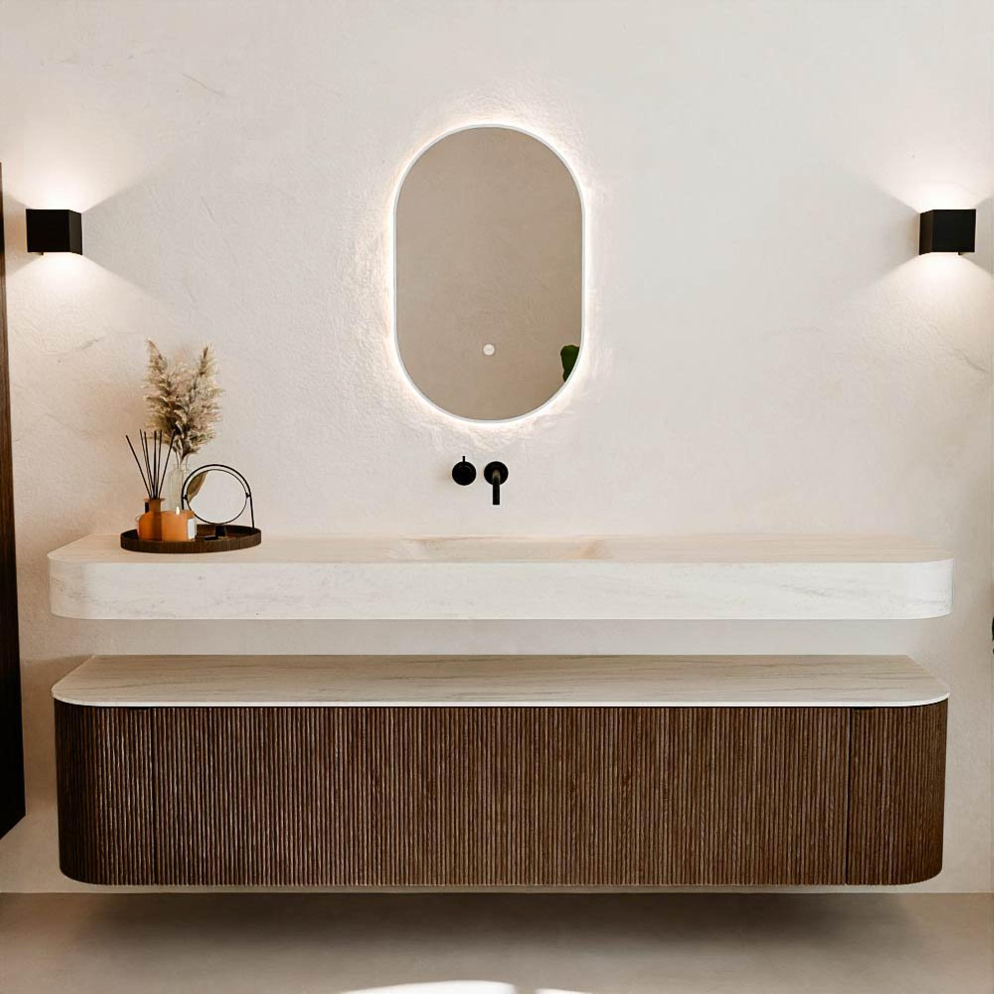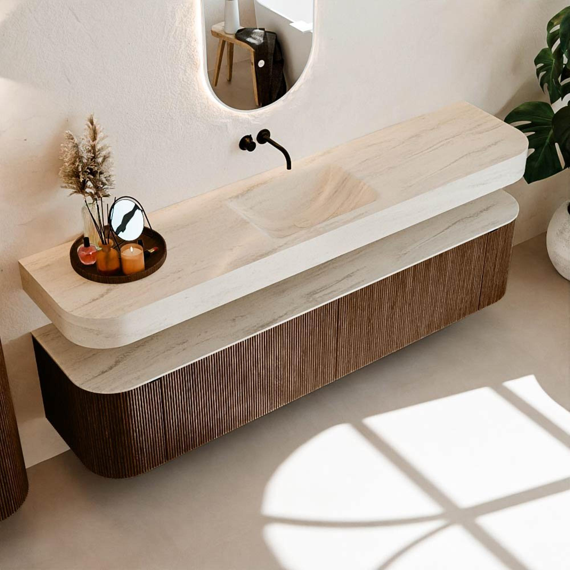 Au-dessus du meuble flotte une vasque suspendue assortie aux coins arrondis – parfaitement adaptée à la forme du meuble. La vasque est réalisée en Solid Surface et suit subtilement les lignes du meuble inférieur, créant ainsi un ensemble harmonieux. Le plan de travail en Solid Surface constitue une base solide et facile d'entretien, complétant la combinaison.