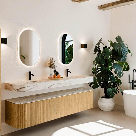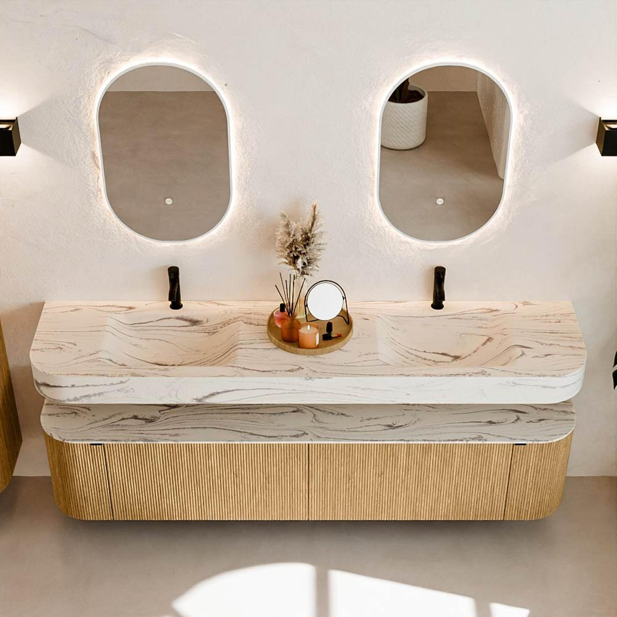 MONDIAZ THOR-DLUX 200cm meuble de salle de bains arrondi gauche + droite couleur Oak avec 2 tiroirs et 2 portes. Vasque suspendue CLOUD Double 2 trous de robinet couleur Nata.