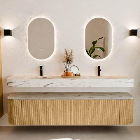 Matériaux naturels aux teintes chaudes. Les nervures verticales apportent rythme et texture au design, tandis que le chêne confère une apparence chaleureuse et artisanale. Choisissez parmi 5 teintes de bois OAK, WALNUT, DUSK, SHADOW et RUBY, des couleurs de bois soigneusement sélectionnées pour enrichir les salles de bains modernes et classiques.