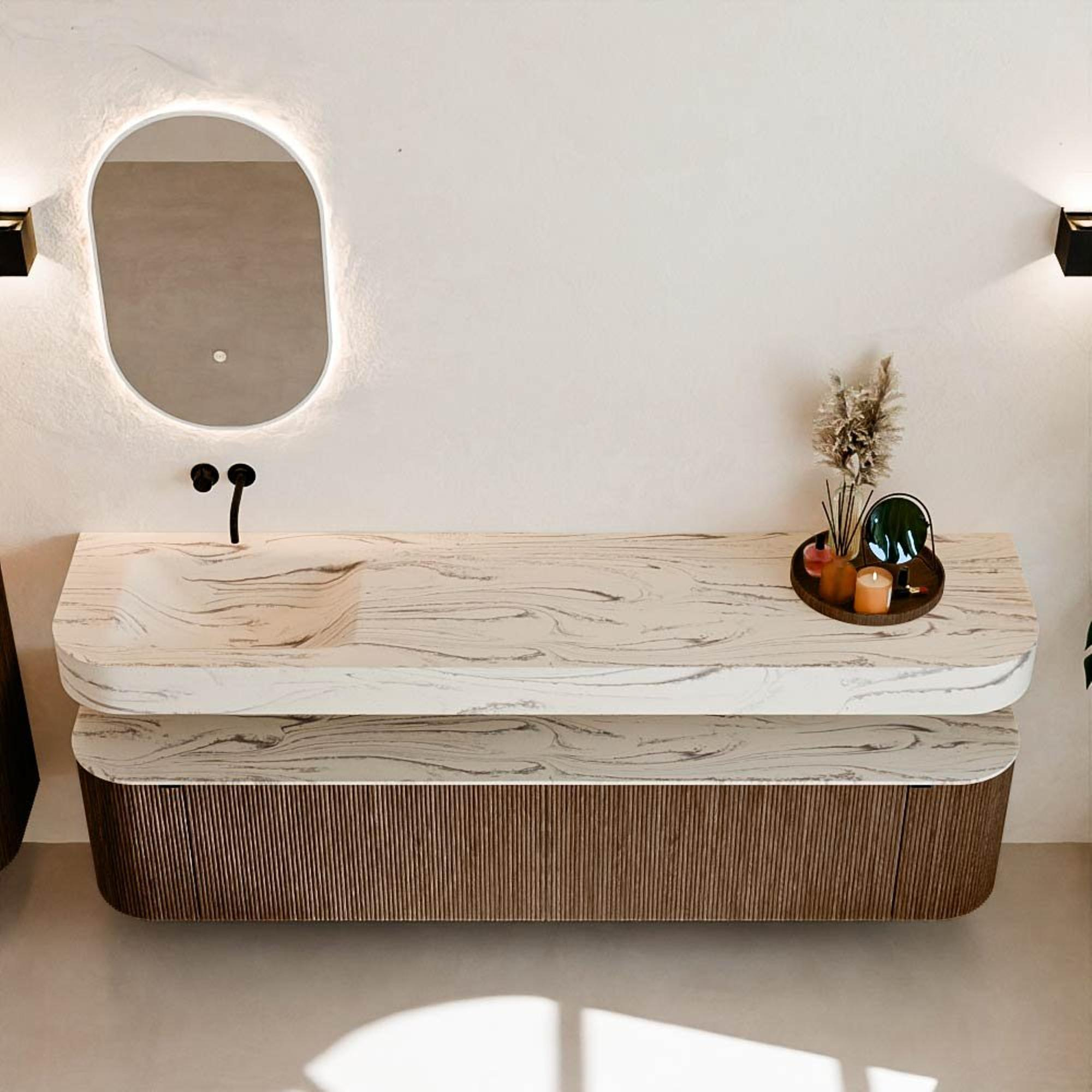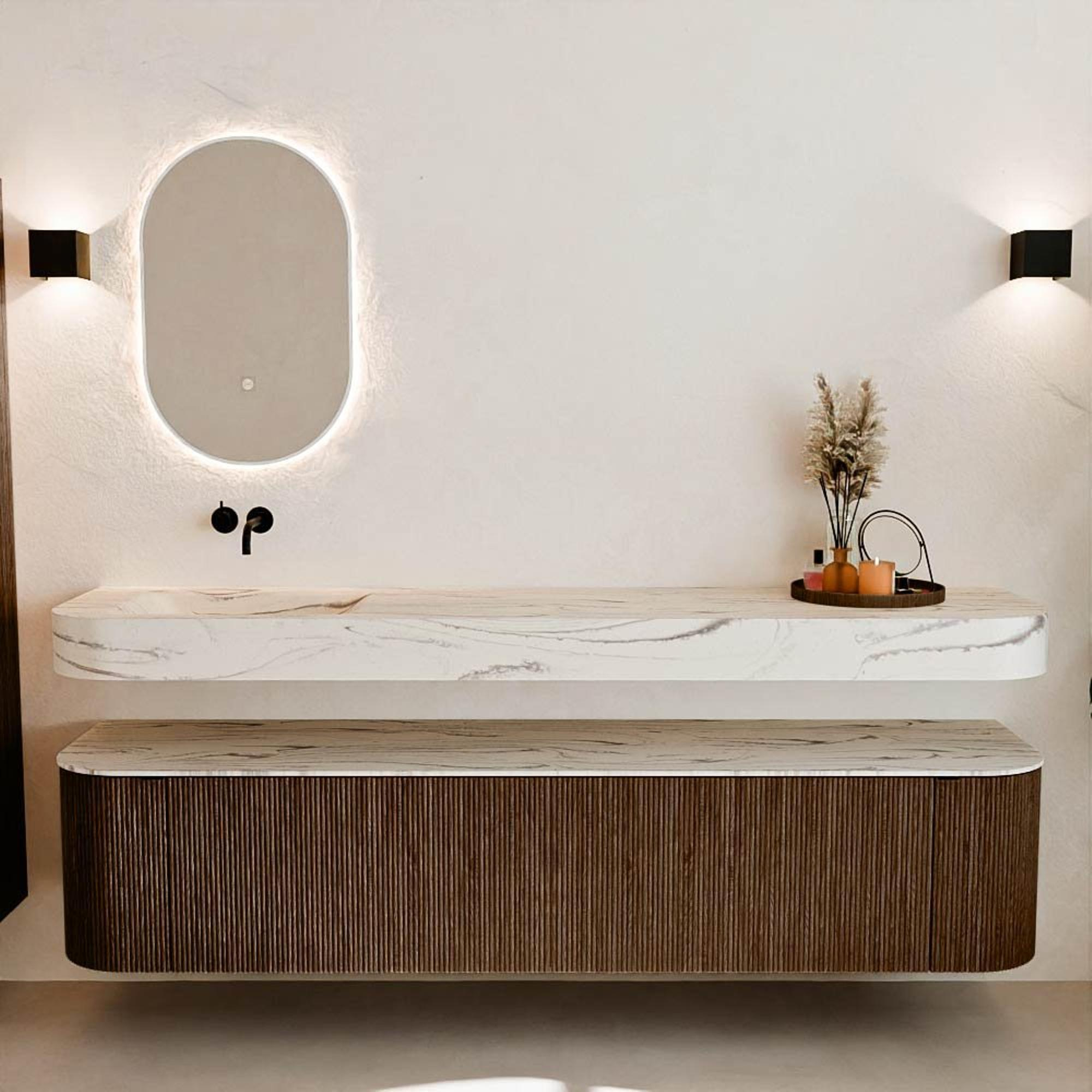 Matériaux naturels dans des tons chauds. Les cannelures verticales apportent rythme et texture au design, tandis que le chêne confère une apparence chaleureuse et artisanale. Choisissez parmi 5 teintes de bois OAK, WALNUT, DUSK, SHADOW et RUBY, des couleurs de bois soigneusement sélectionnées pour enrichir les salles de bains modernes et classiques.
