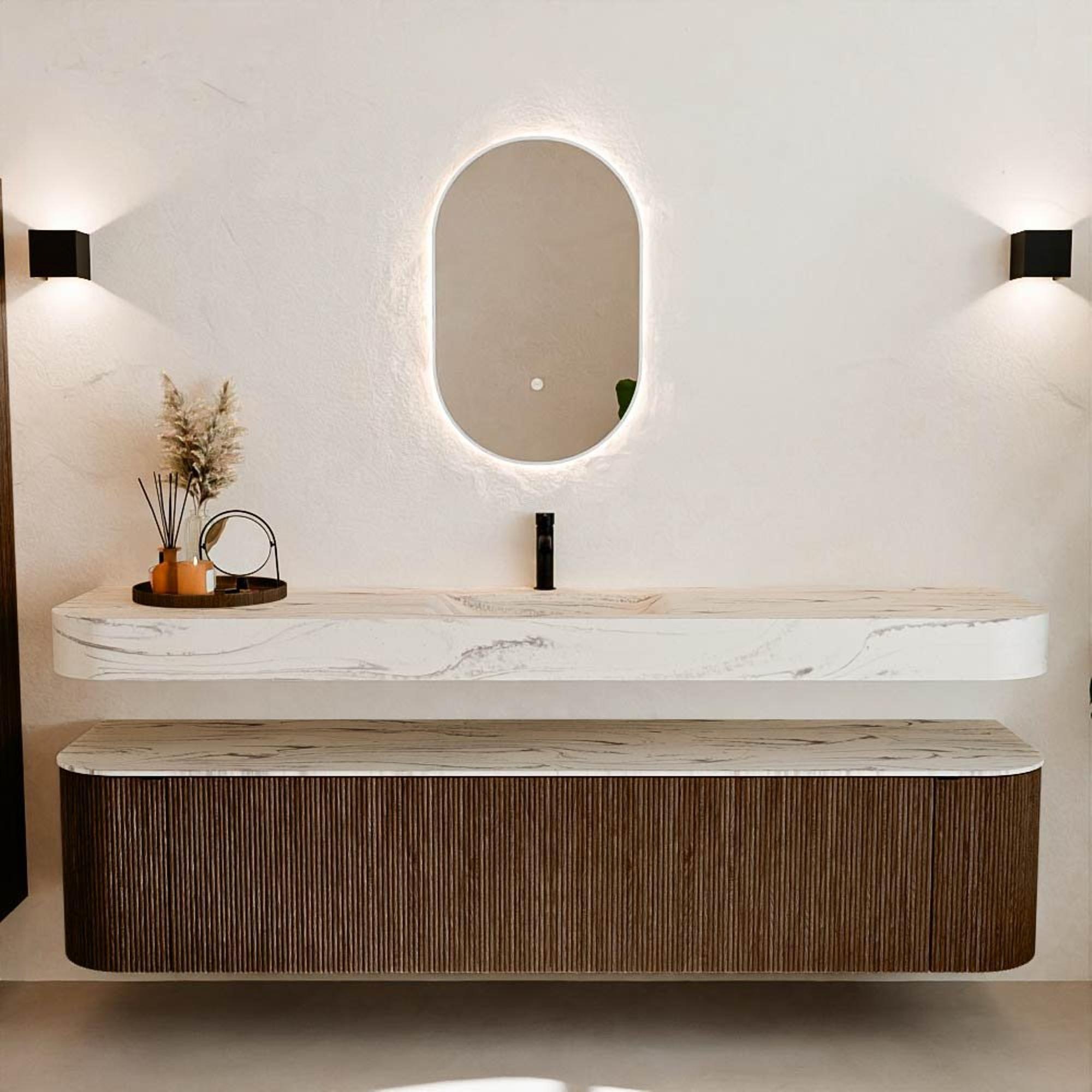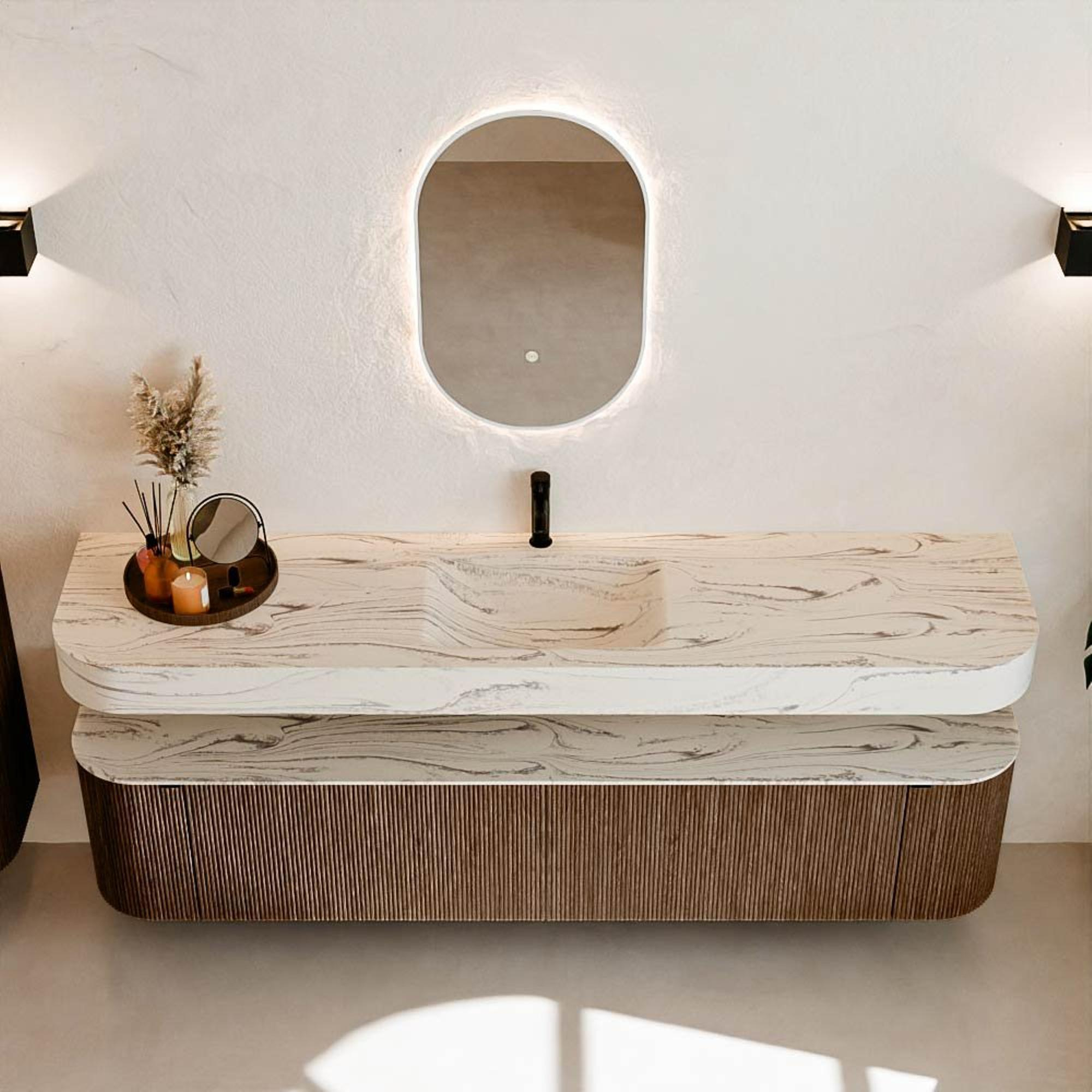 Au-dessus du meuble flotte une vasque suspendue assortie aux coins arrondis – parfaitement adaptée à la forme du meuble. La vasque est en Solid Surface et suit subtilement les lignes du meuble inférieur, créant un ensemble harmonieux. Le plan de travail en Solid Surface constitue une base solide, facile d'entretien, complétant la combinaison.