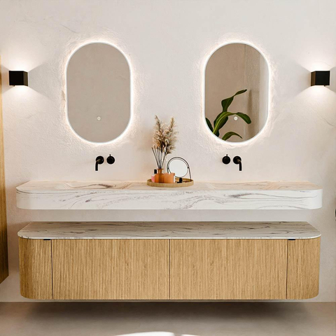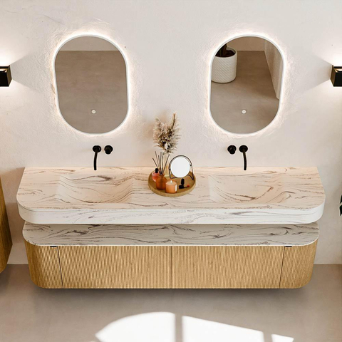 Matériaux naturels aux teintes chaudes. Les cannelures verticales apportent rythme et texture au design, tandis que le chêne confère une apparence chaleureuse et artisanale. Choisissez parmi 5 teintes de bois CHÊNE, NOYER, DUSK, SHADOW et RUBY, des couleurs de bois soigneusement sélectionnées pour enrichir les salles de bains modernes et classiques.