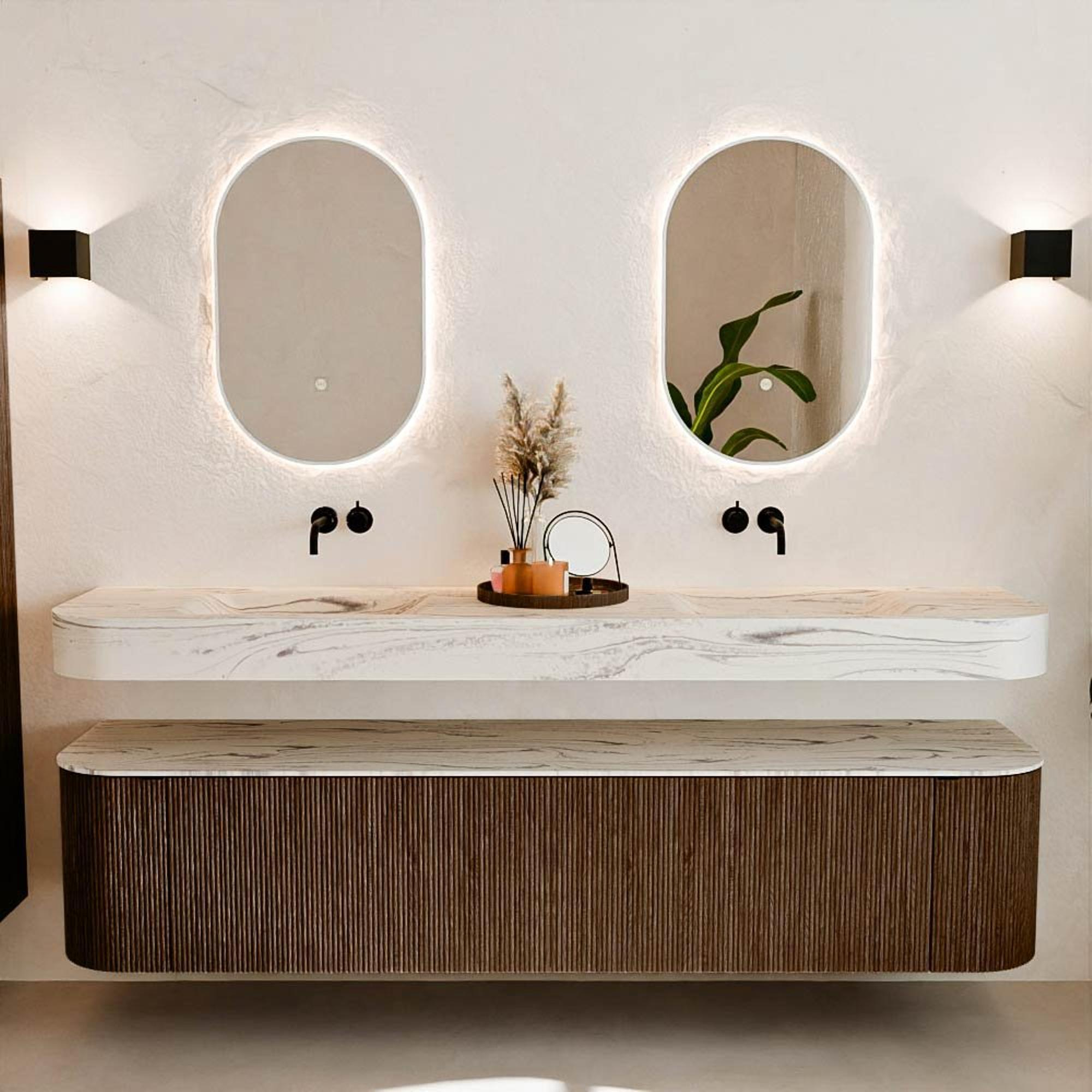 Matériaux naturels dans des tons chauds. Les nervures verticales apportent rythme et texture au design, tandis que le chêne confère une apparence chaleureuse et artisanale. Choisissez parmi 5 teintes de bois OAK, WALNUT, DUSK, SHADOW et RUBY, des couleurs de bois soigneusement sélectionnées pour enrichir les salles de bains modernes et classiques.