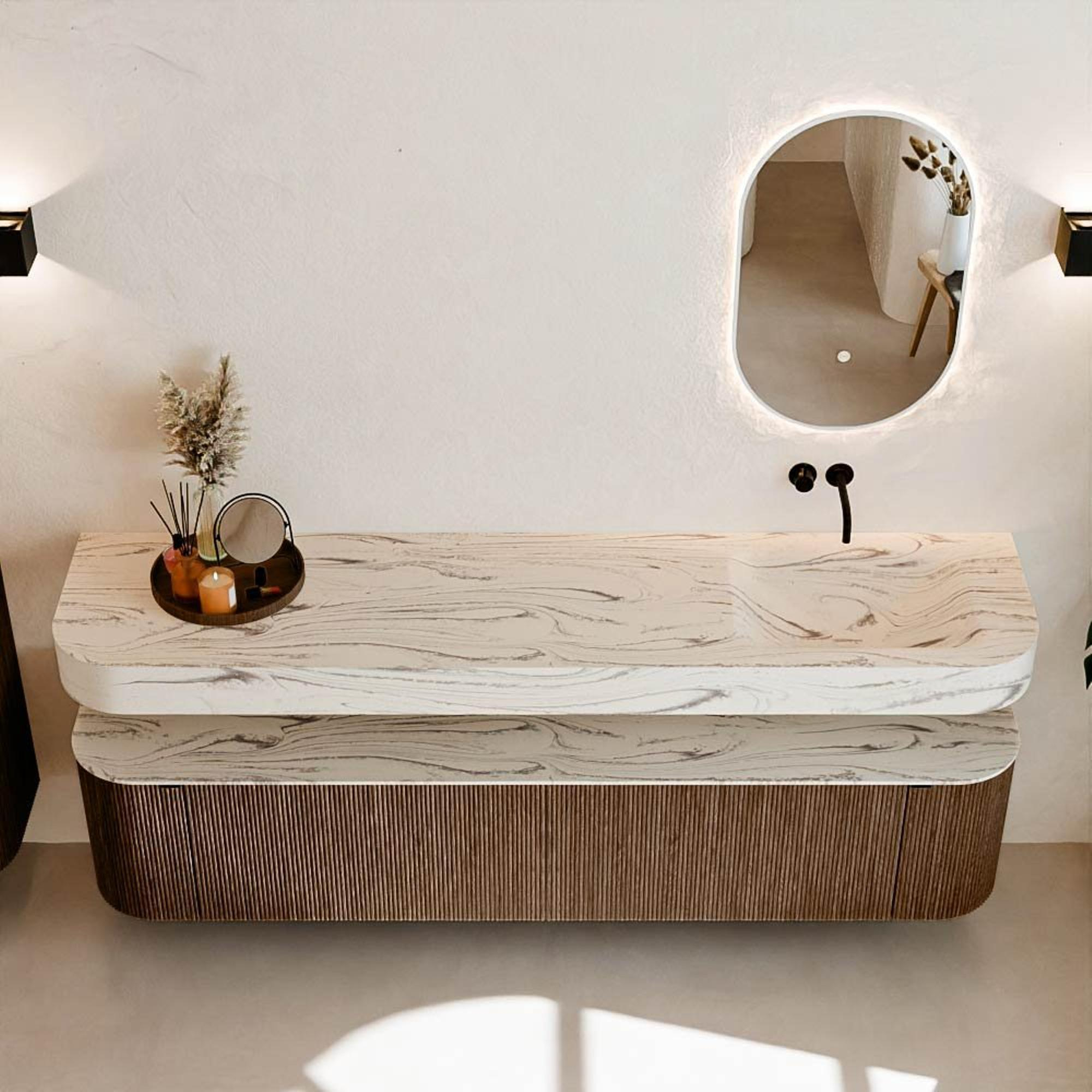 MONDIAZ THOR-DLUX 200cm meuble de salle de bains arrondi gauche + droite couleur Walnut avec 2 tiroirs et 2 portes. Vasque suspendue CLOUD droite sans trou de robinet couleur Nata.