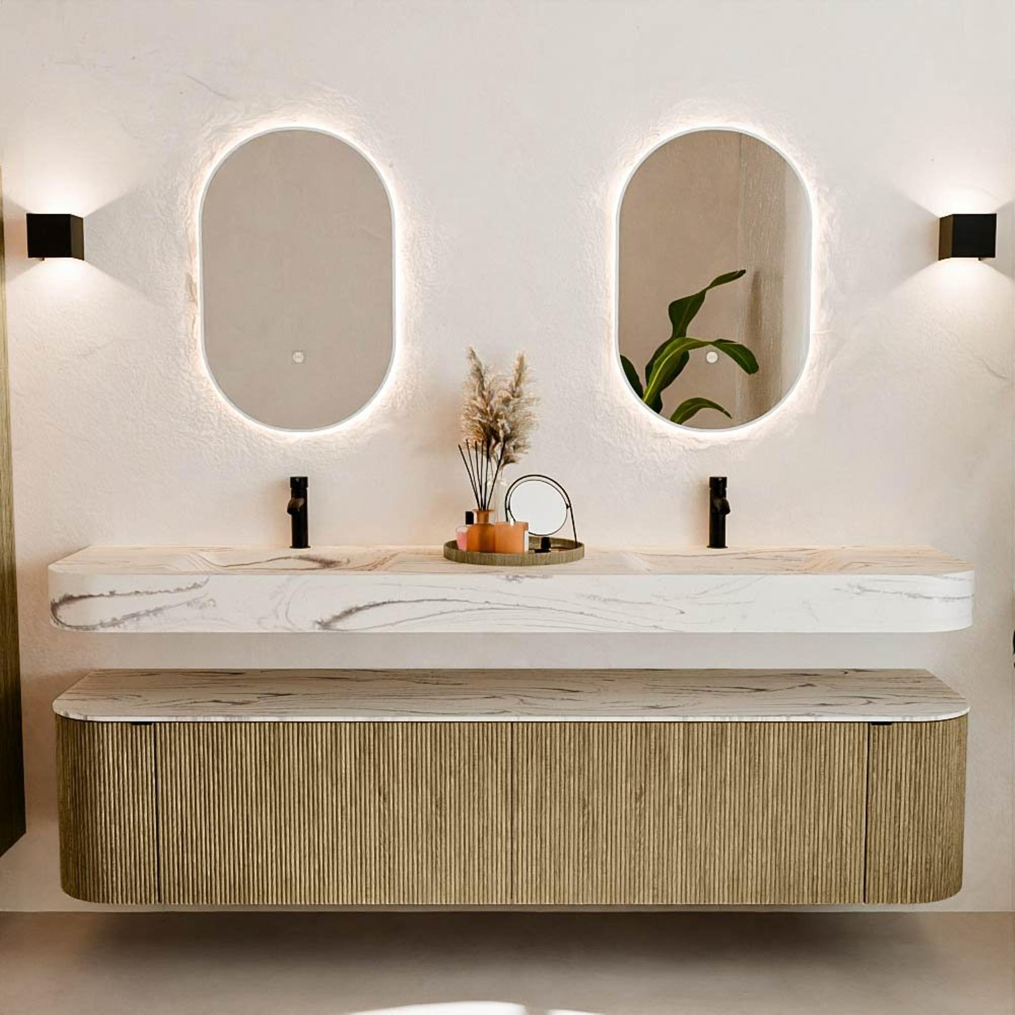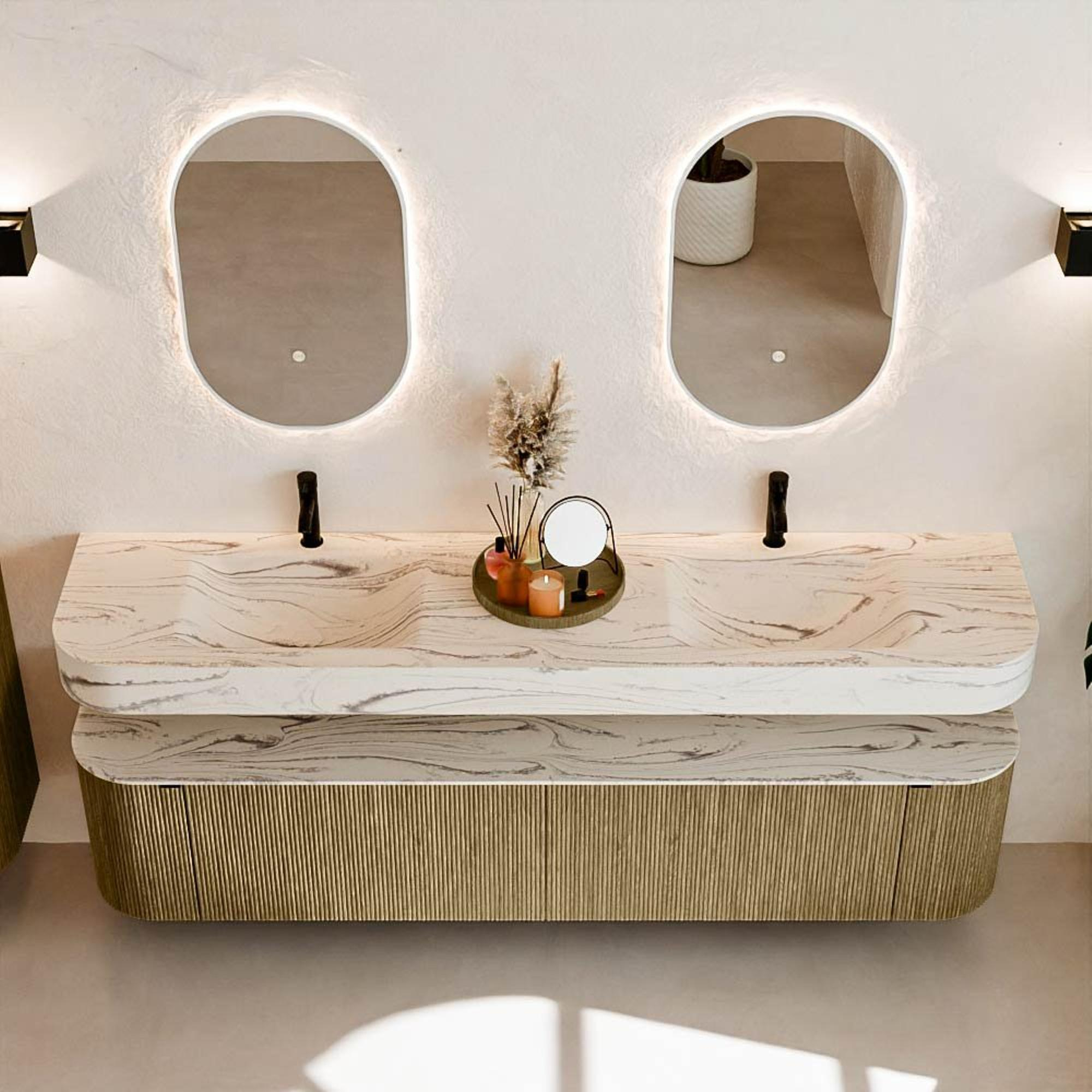 Matériaux naturels dans des tons chauds. Les nervures verticales apportent rythme et texture au design, tandis que le chêne confère une apparence chaleureuse et artisanale. Choisissez parmi 5 teintes de bois OAK, WALNUT, DUSK, SHADOW et RUBY, des couleurs de bois soigneusement sélectionnées pour enrichir les salles de bains modernes et classiques.