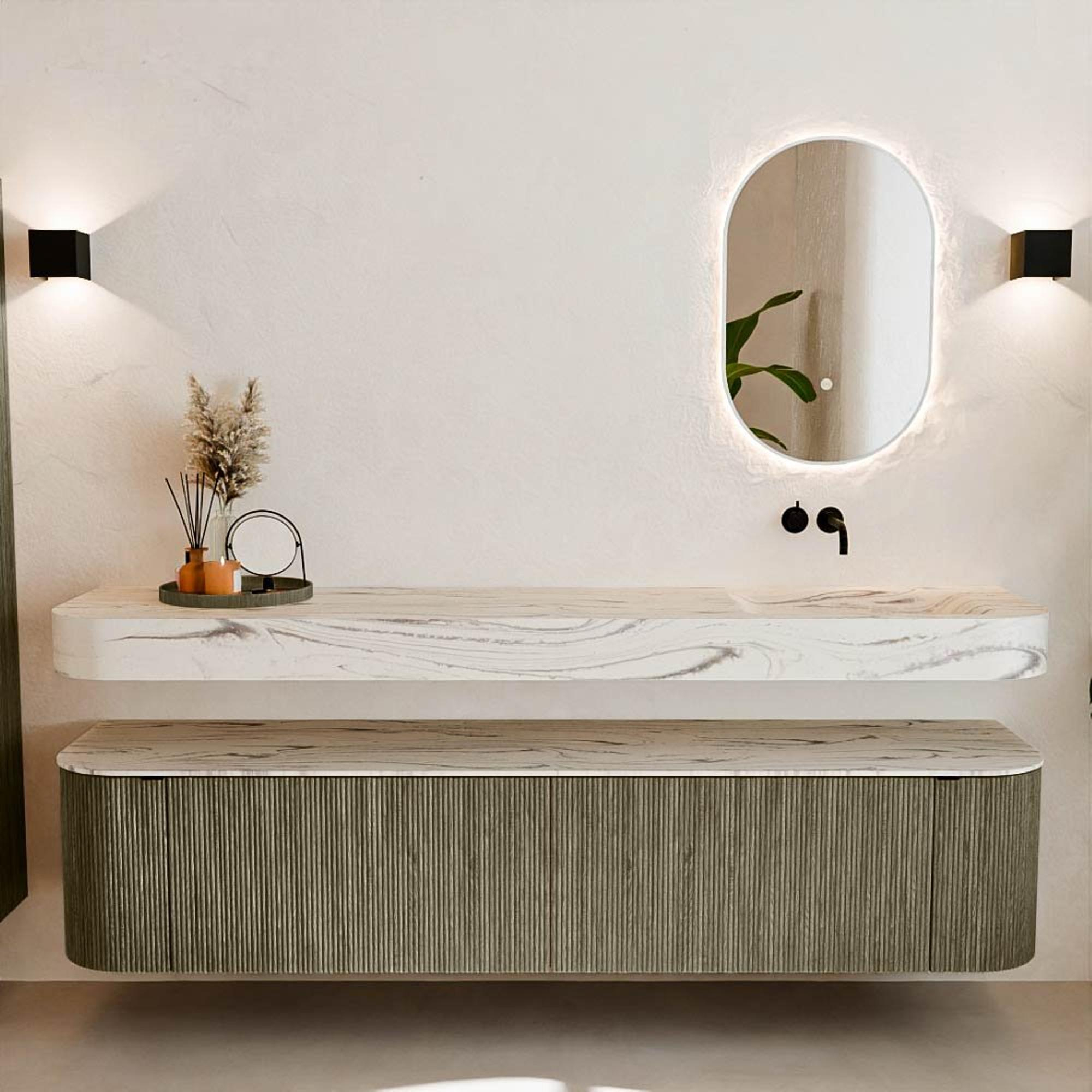 Au-dessus du meuble flotte une vasque suspendue assortie aux coins arrondis – parfaitement adaptée à la forme du meuble. La vasque est réalisée en Solid Surface et suit subtilement les lignes du meuble inférieur, créant ainsi un ensemble harmonieux. Le plan de travail en Solid Surface constitue une base solide et facile d'entretien, complétant la combinaison.