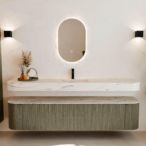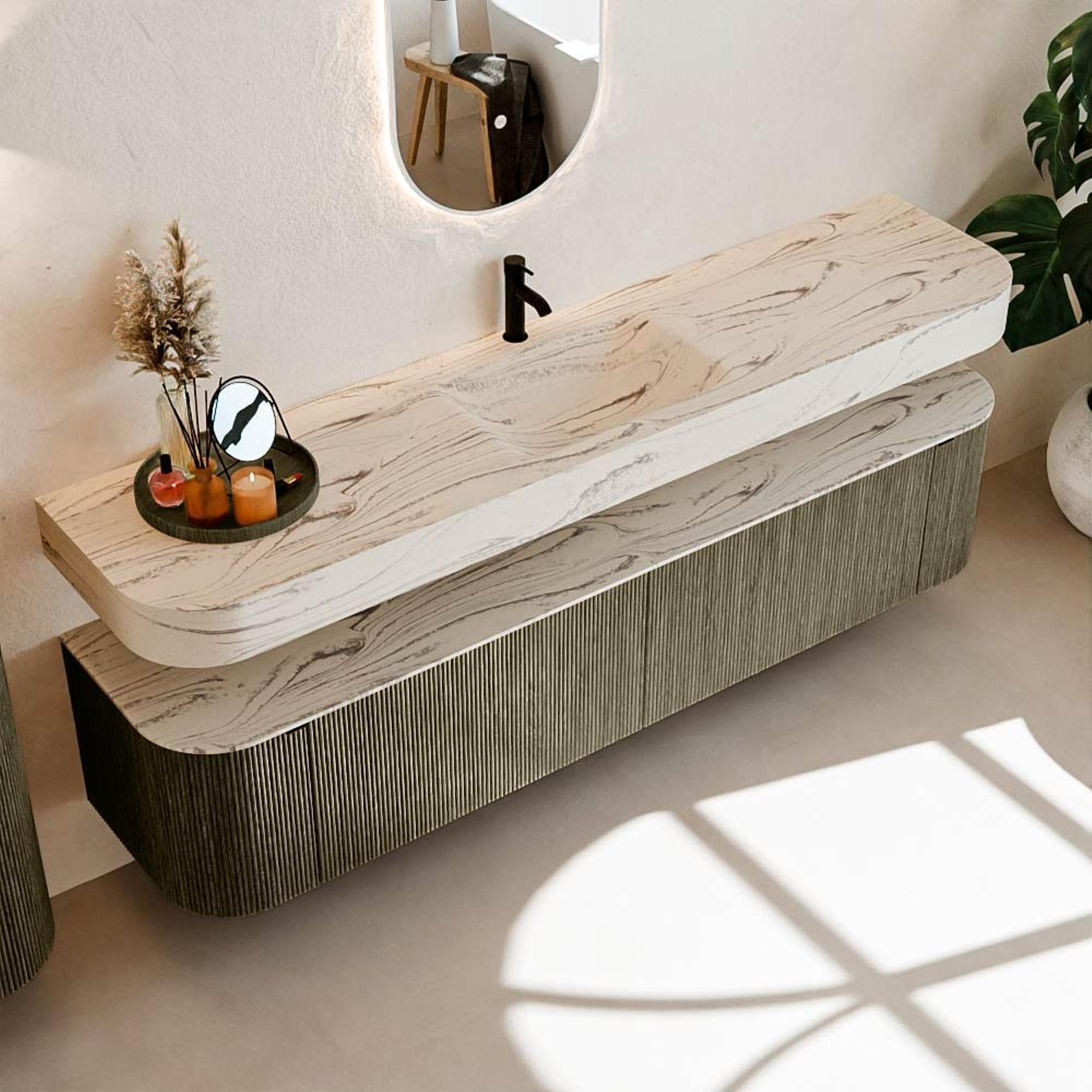 Au-dessus du meuble flotte une vasque suspendue assortie aux coins arrondis – parfaitement adaptée à la forme du meuble. La vasque est réalisée en Solid Surface et suit subtilement les lignes du meuble inférieur, créant ainsi un ensemble harmonieux. Le plan de travail en Solid Surface forme une base solide, facile d'entretien et complète la combinaison.