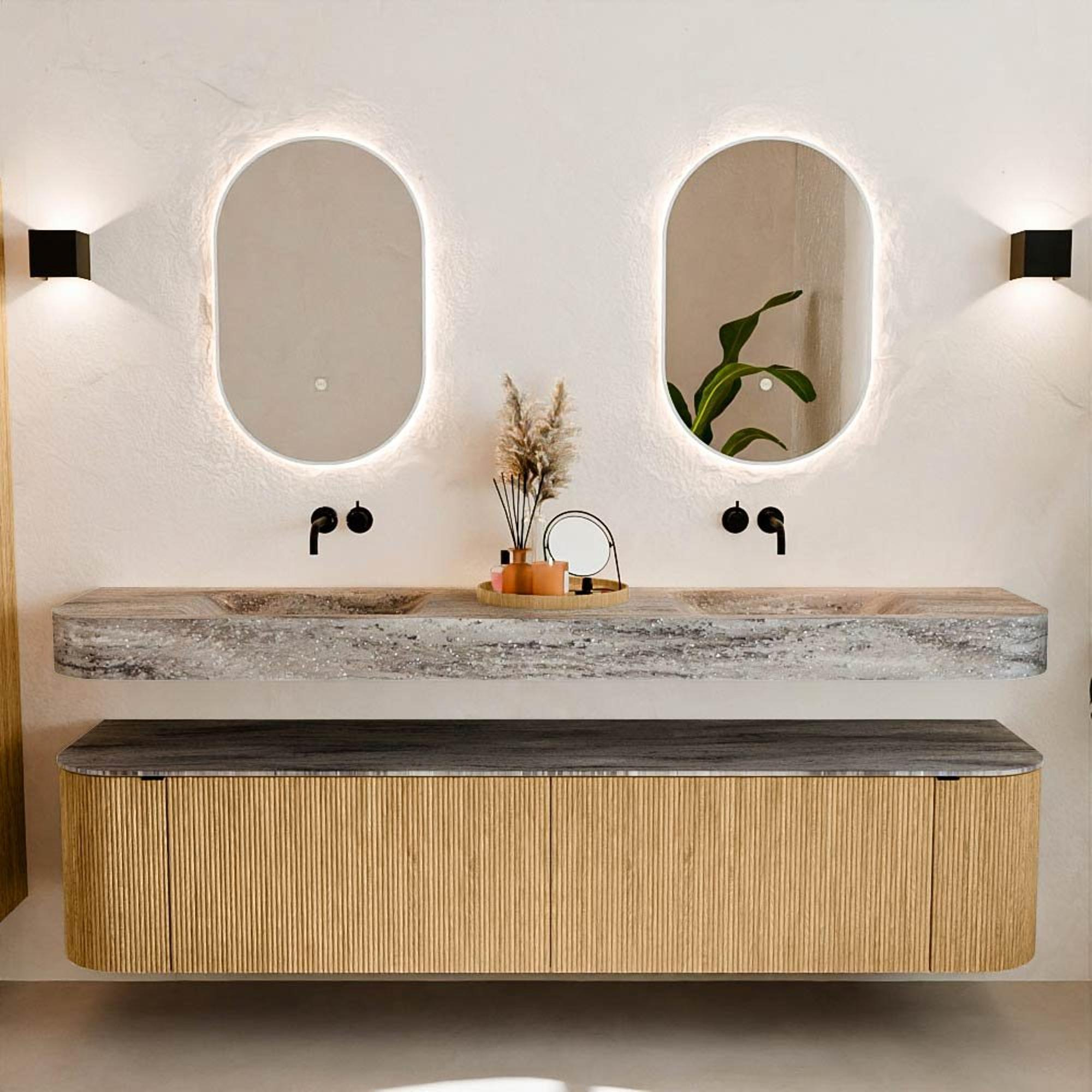 MONDIAZ THOR-DLUX 200cm meuble de salle de bains arrondi gauche + droite couleur Oak avec 2 tiroirs et 2 portes. Vasque suspendue CLOUD Double sans trou de robinet couleur Oza.