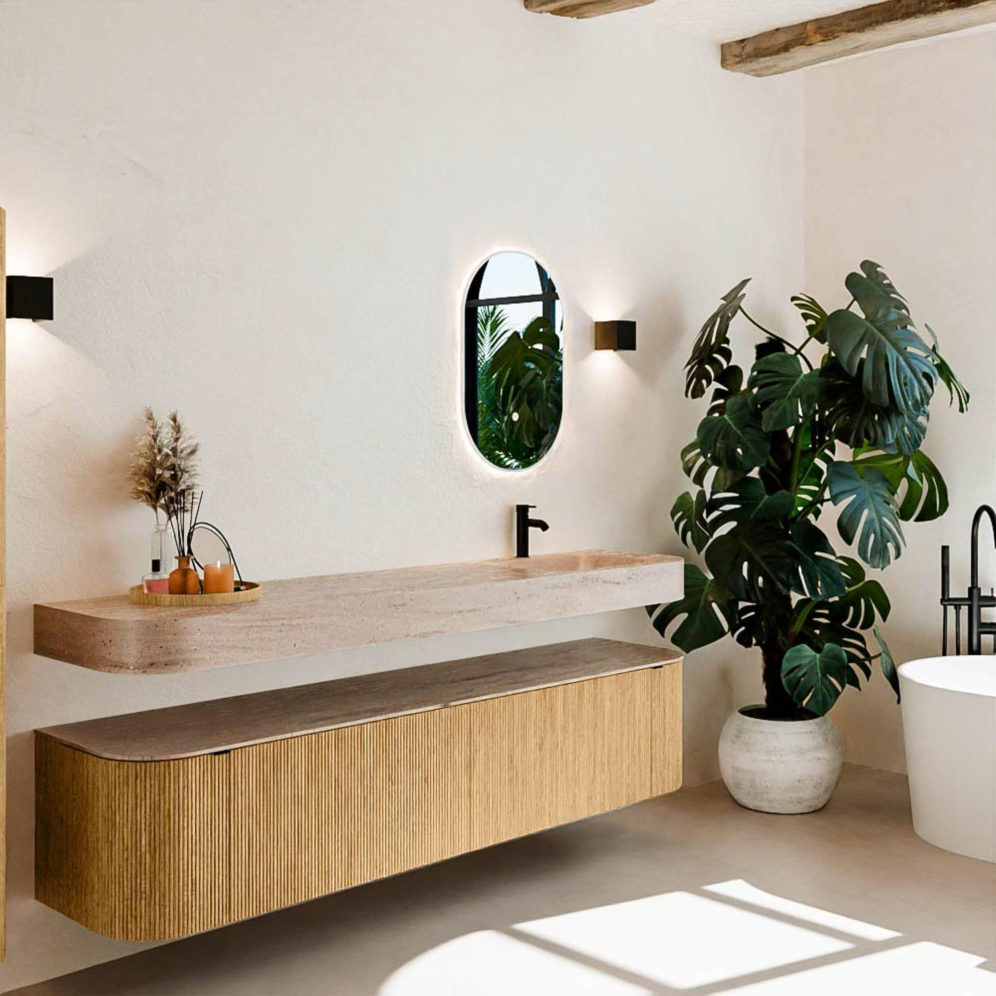 Matériaux naturels dans des tons chauds. Les nervures verticales apportent rythme et texture au design, tandis que le chêne confère une apparence chaleureuse et artisanale. Choisissez parmi 5 teintes de bois OAK, WALNUT, DUSK, SHADOW et RUBY, des couleurs de bois soigneusement sélectionnées pour enrichir les salles de bains modernes et classiques.