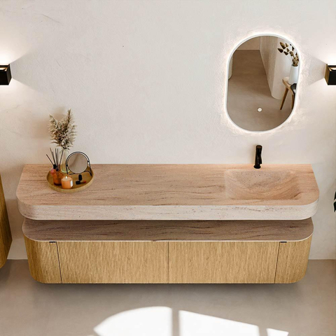 Au-dessus du meuble flotte une vasque suspendue assortie aux coins arrondis – parfaitement adaptée à la forme du meuble. La vasque est réalisée en Solid Surface et suit subtilement les lignes du meuble inférieur, créant un ensemble harmonieux. Le plan de travail en Solid Surface forme une base solide, facile d'entretien et complète la combinaison.