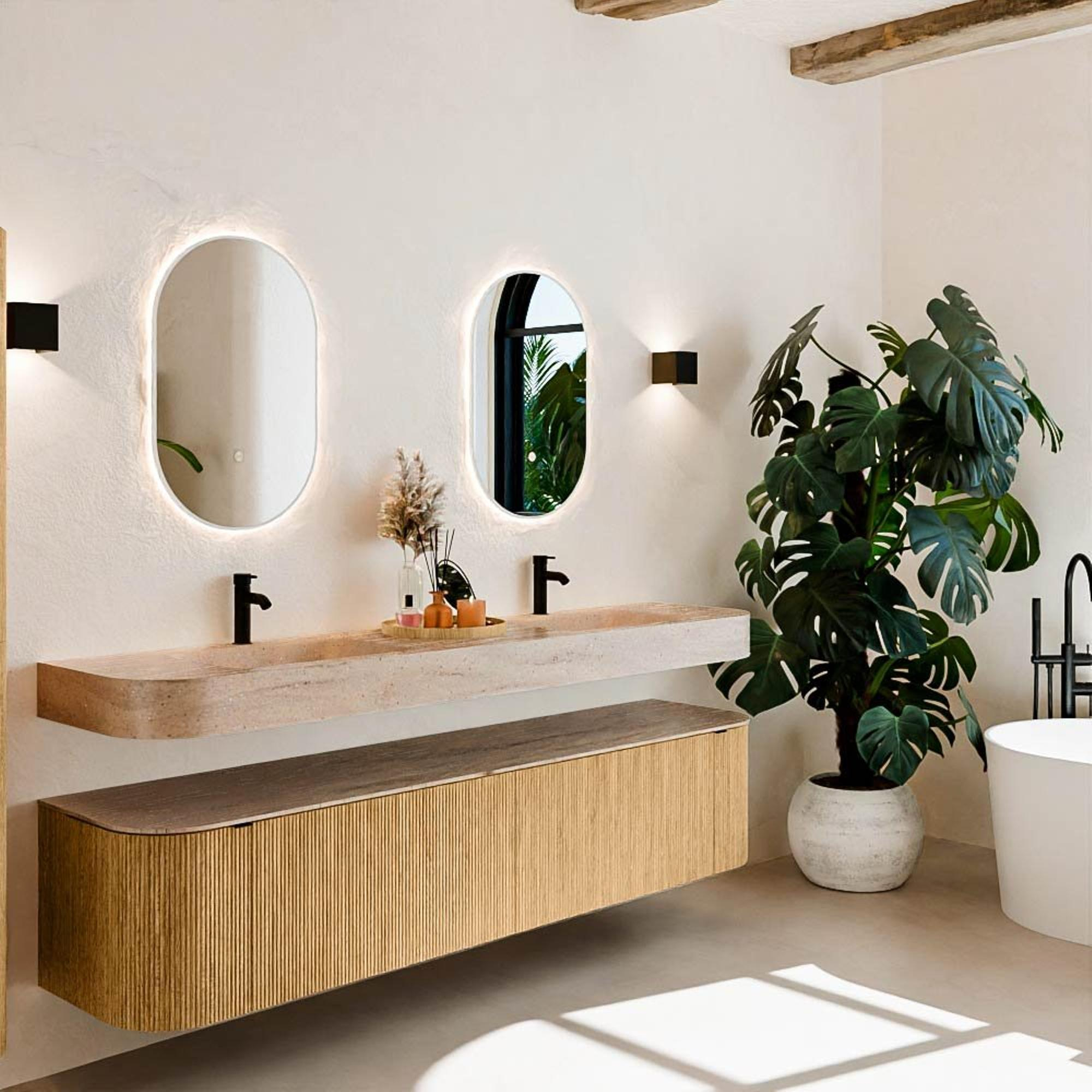 MONDIAZ THOR-DLUX Meuble de salle de bains - 200cm - arrondi gauche + droite - couleur Oak - 2 tiroirs et 2 portes - Vasque suspendue CLOUD Double 2 trous de robinet - couleur Saba